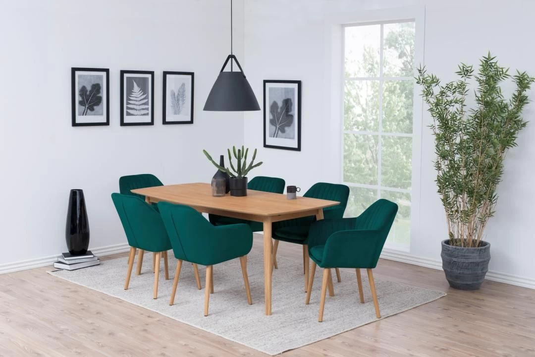 De Hermeline stoel met armleuningen is bekleed met groene fluweel en versierd met verticale stiksels. De stoel beschikt over een comfortabel zitkussen en heeft poten uit massief eikenhout. Met deze luxueuze stoel aan je tafel geef je gegarandeerd wat cachet aan je eetkamer!