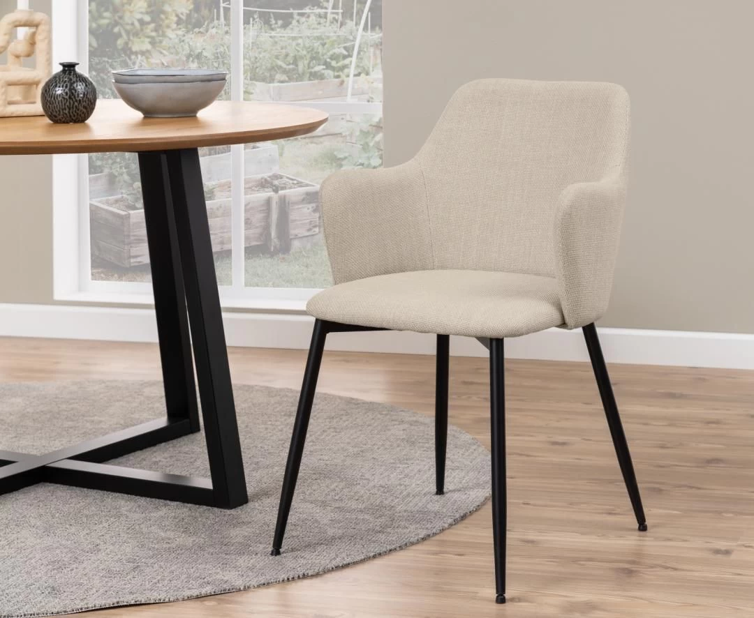 Maak het jezelf comfortabel met eetkamerstoel Ilsa. Deze eetkamerstoel is voorzien van armleuningen, waarop je je armen tijdens de maaltijd kunt laten rusten. Deze stoel heeft daarnaast ook een 39 cm hoge rugleuning, wat je zithouding dan weer ten goede komt. De stoel is bekleed met beige Baselstof en heeft poten uit zwart gepoedercoat metaal. Deze poten geven de stoel een stoere touch.