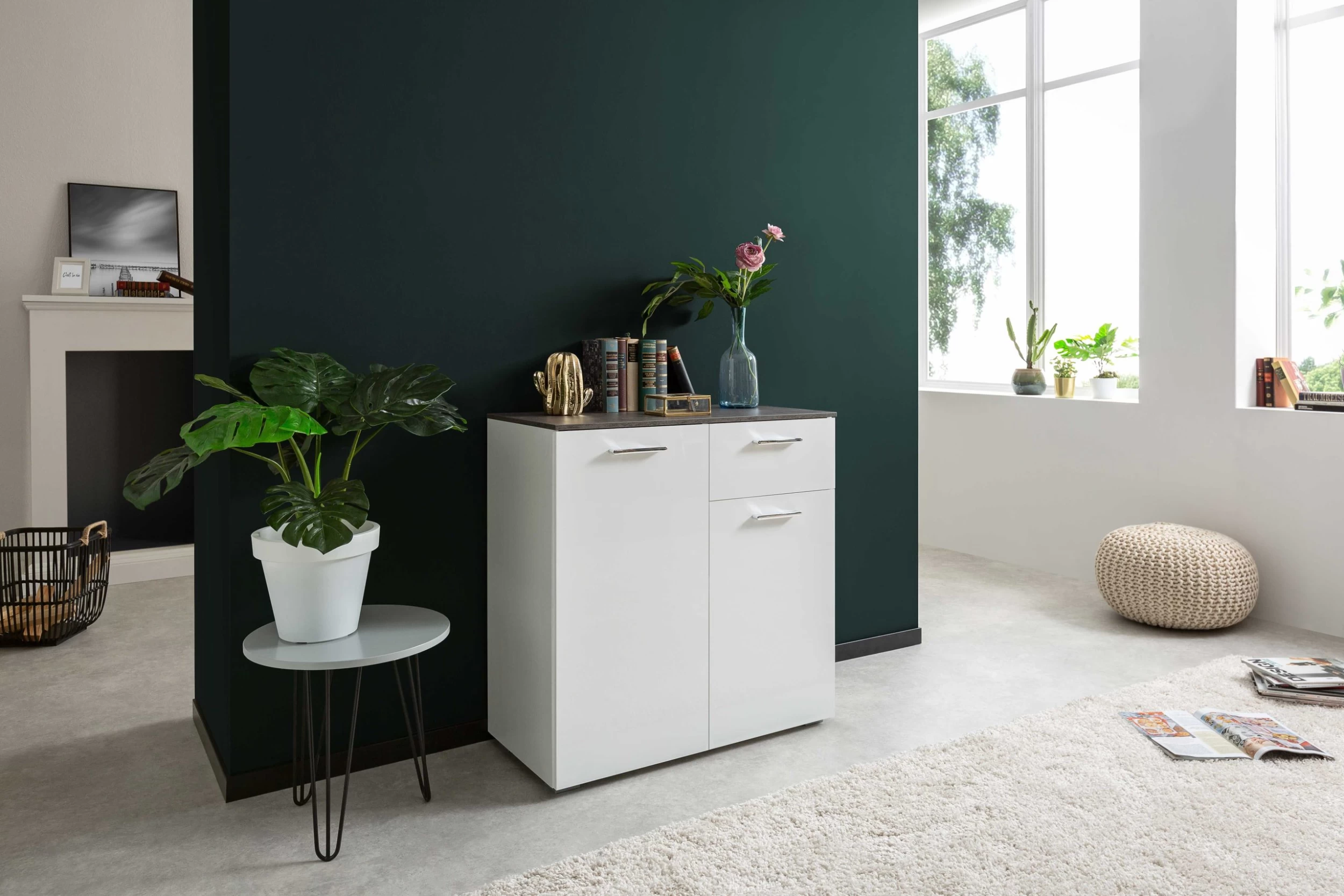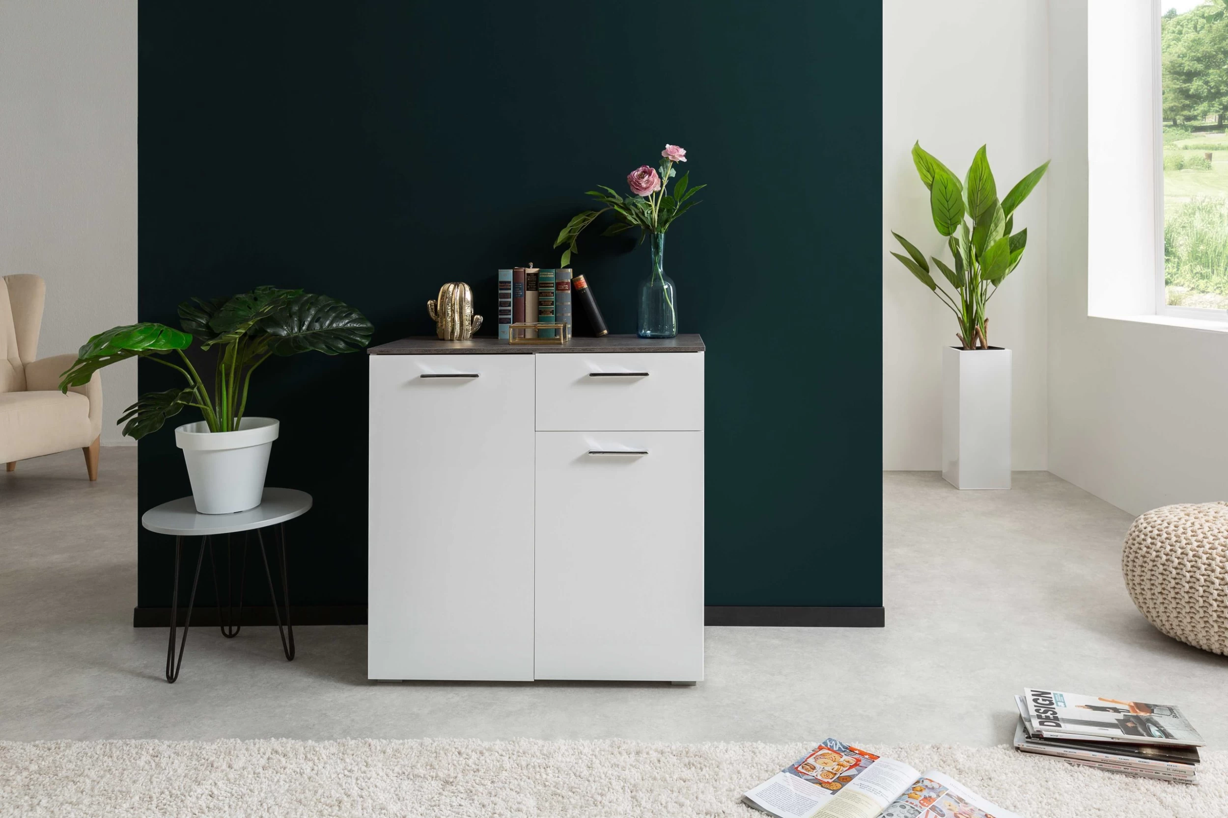 Bijzetkastje Magic met 2 deuren, 3 legplanken en 1 lade. Gemaakt van spaanplaat. Bovenblad in betonlook.