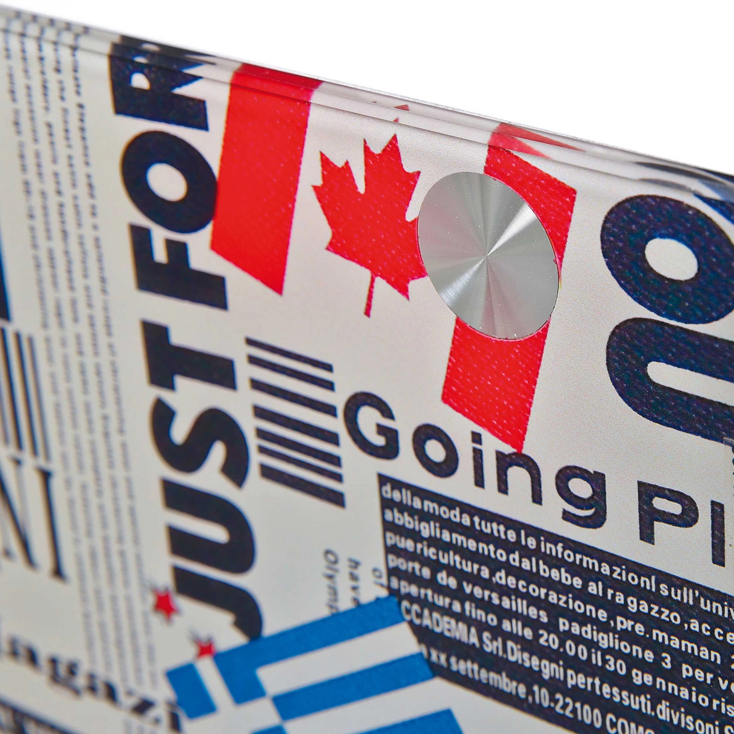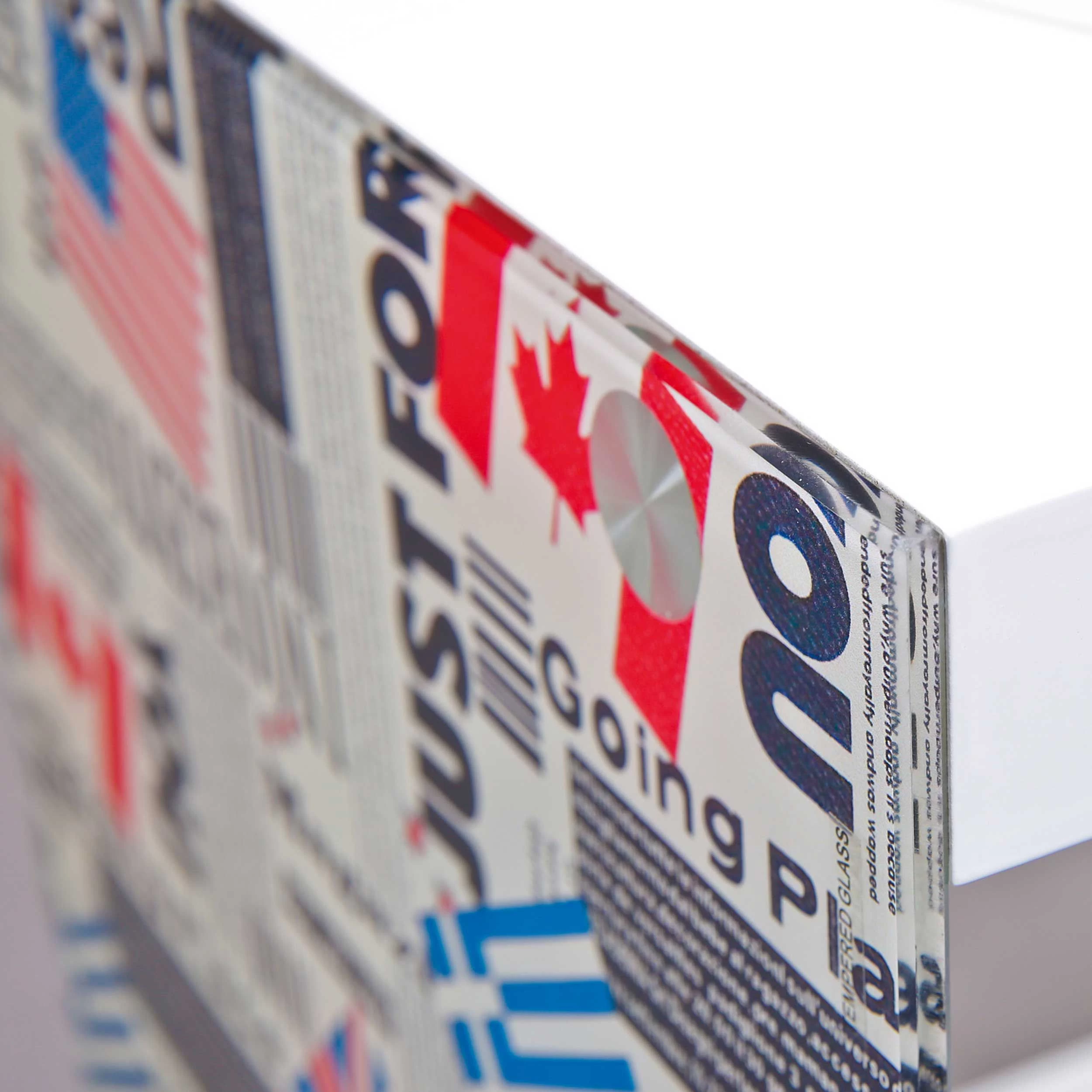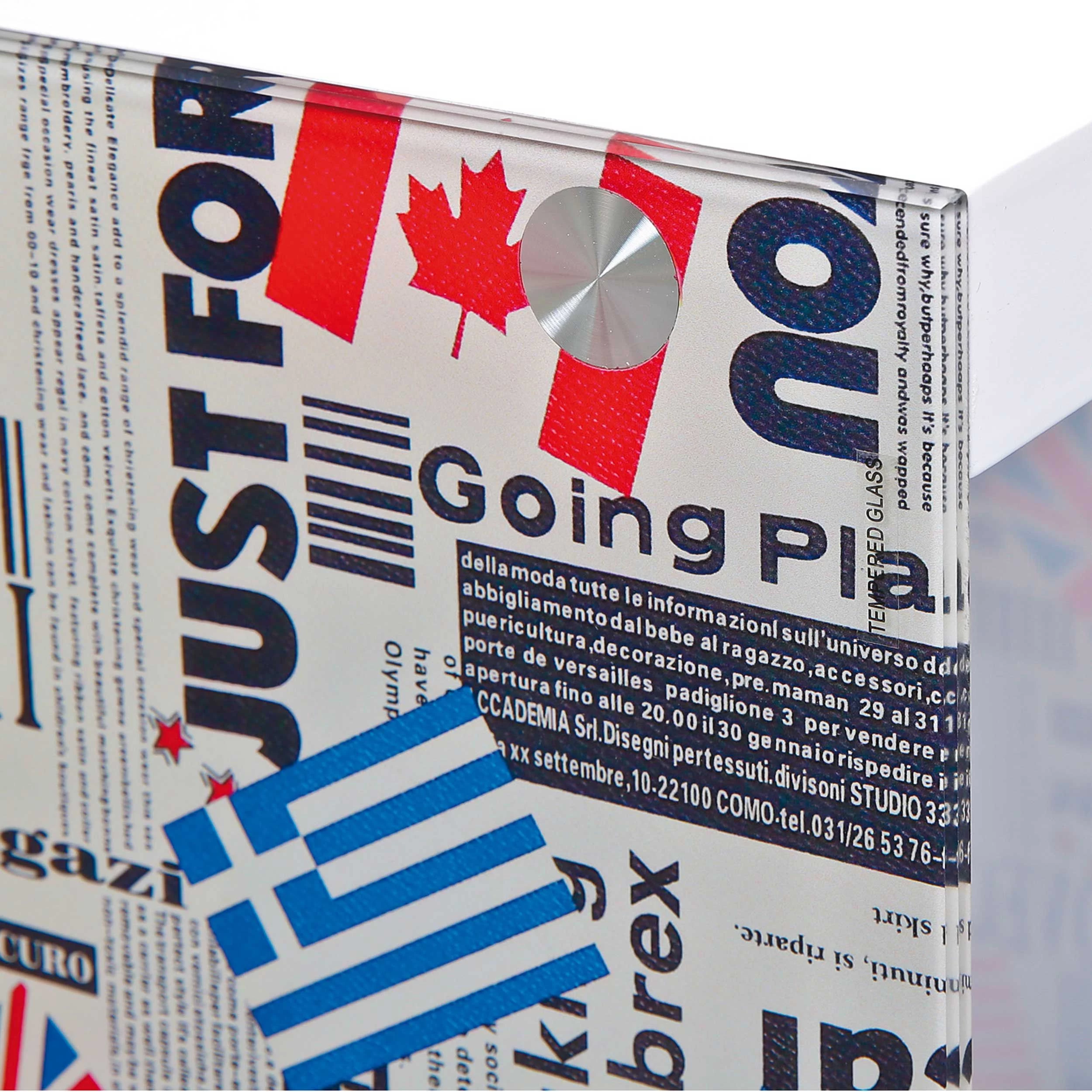 Dit praktische bijzettafeltje is gemaakt van MDF en veiligheidsglas. Dankzij de 4 wieltjes kan het tafeltje gemakkelijk verplaatst worden. Op het veiligheidsglas vind je een trendy tekening met vlaggen van de VS, Canada, Groot-Brittannië en Griekenland. Een leuk accessoire om je woning of appartement op te vrolijken!