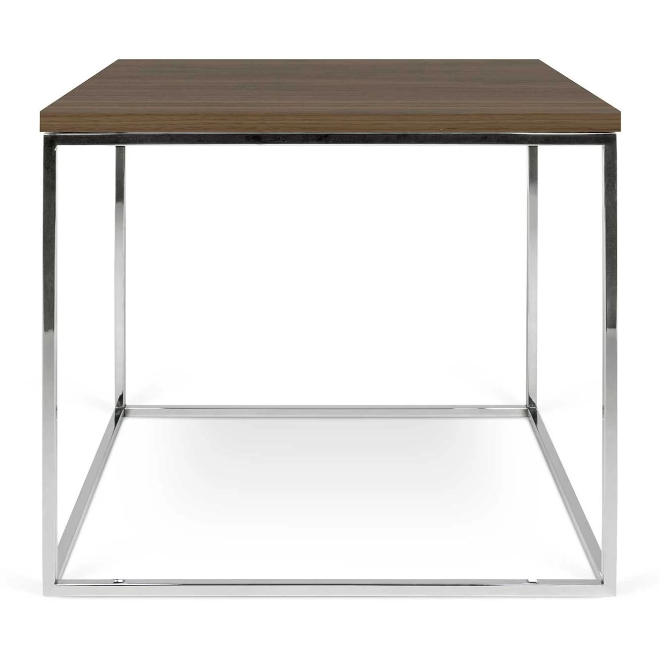 Vierkant bijzettafeltje Gleam met tafelblad in walnootfineer en onderstel in verchroomd staal.