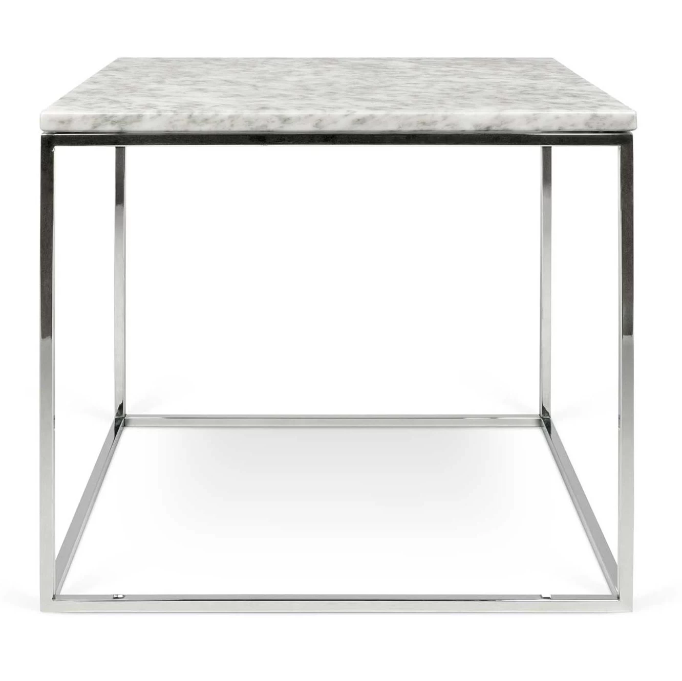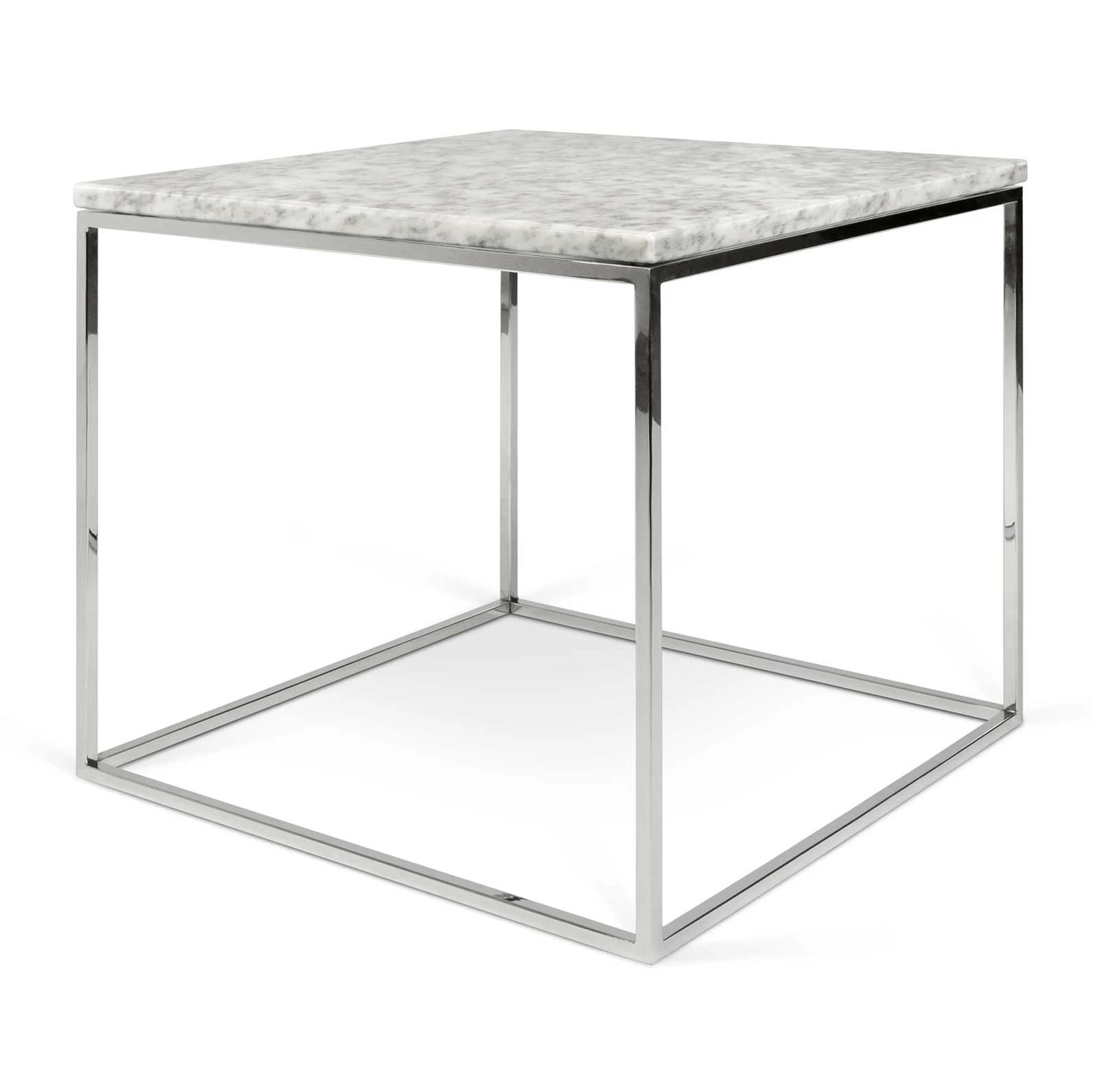 Vierkant bijzettafeltje Gleam met tafelblad van wit marmer en onderstel van verchroomd staal.