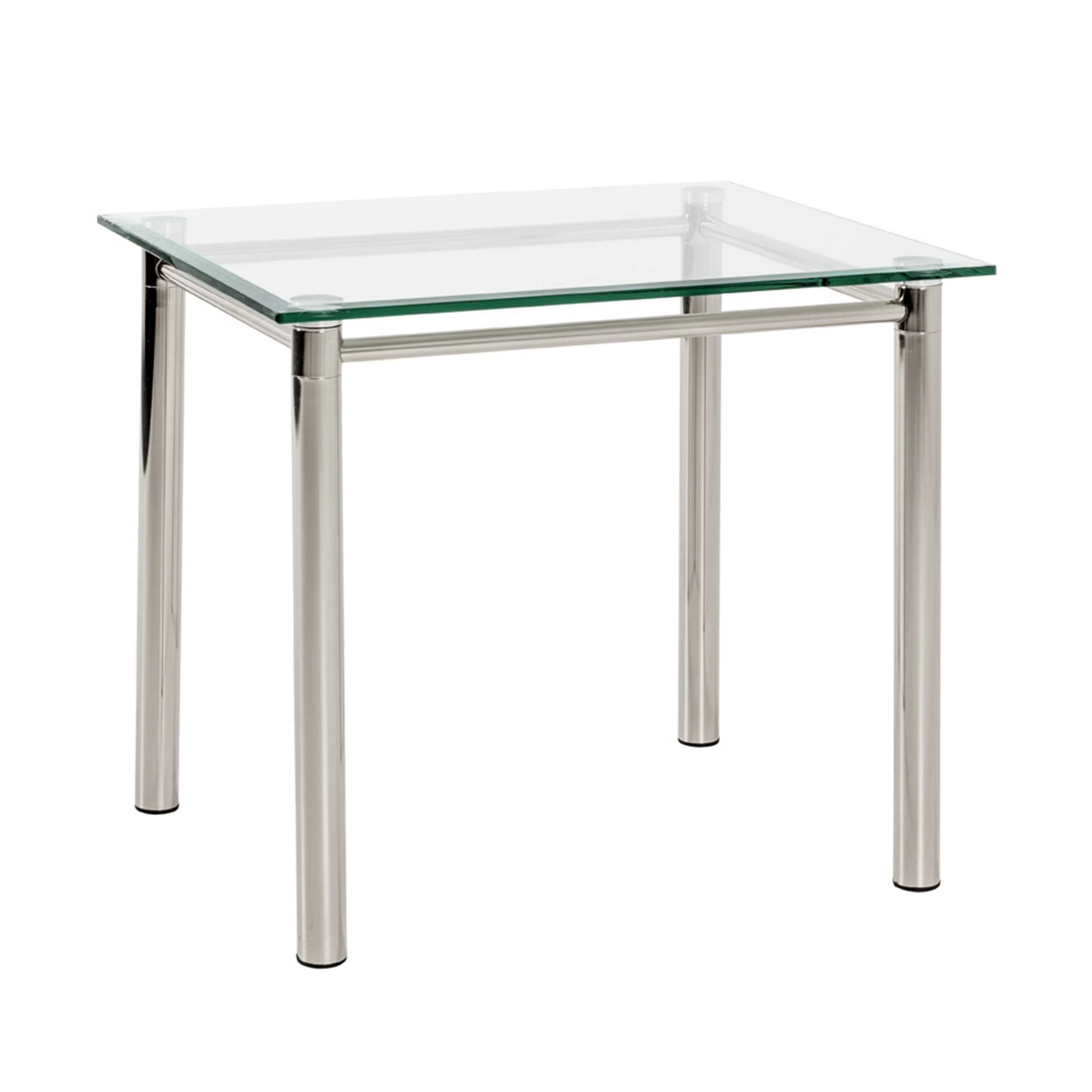 Dit praktisch bijzettafeltje beschikt over een glazen tafelblad. Je kan er gemakkelijk mooie decoratiestukken, planten of een tafellamp op plaatsen. Het tafeltje beschikt over een lengte van 60 cm op een breedte van 50 cm en meet 53 cm hoog. De poten zijn gemaakt uit chroomkleurig metaal.