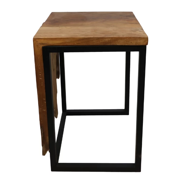 Bijzettafel uit teakhout en ijzer. Tafelblad vormt de natuurlijke vorm van het hout.