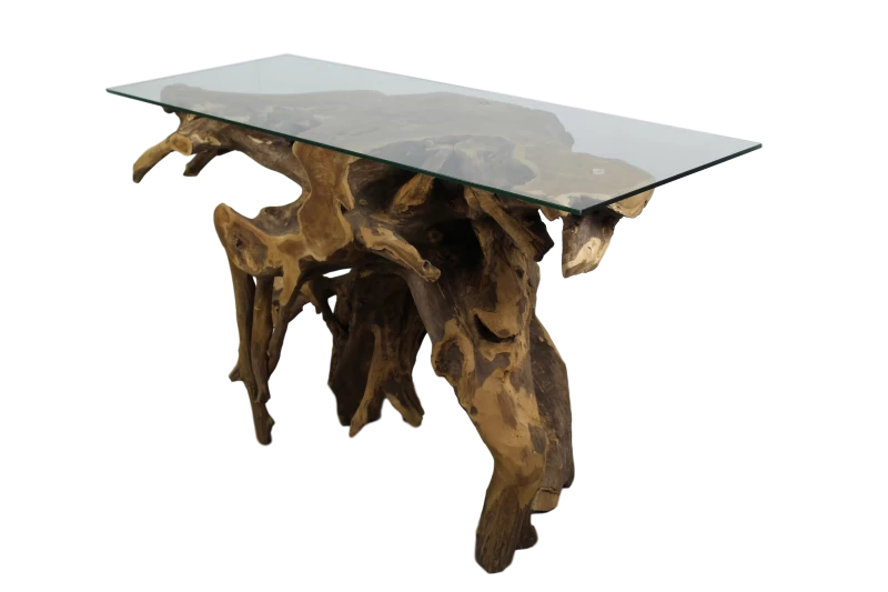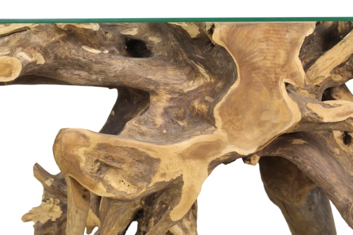 Bijzettafeltje Root is gemaakt uit teak wortelhout en een transparant tafelblad in glas.