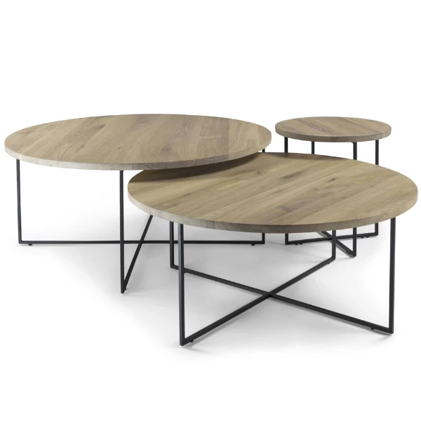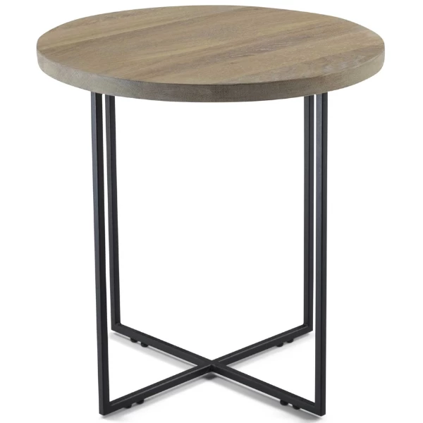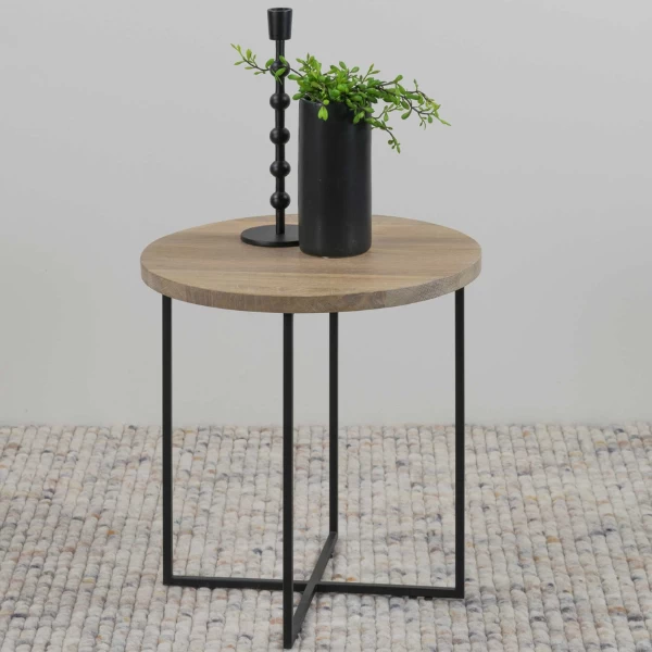 Bijzettafeltje Serafien heeft een zwart gepoedercoat stalen onderstel en een massief eikenhouten blad.