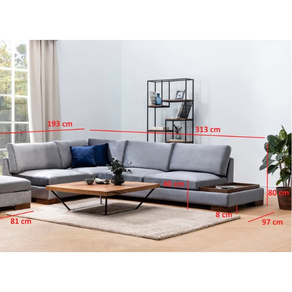 Op zoek naar de perfecte hoekbank om je woonkamer op te fleuren? Kijk dan niet verder dan onze prachtige hoekbank! Deze bank biedt niet alleen ongeëvenaard comfort, maar voegt ook een vleugje uniek design toe aan je ruimte. Een van de belangrijkste kenmerken van deze hoekbank is de hoogwaardige constructie. Het frame van de bank is gemaakt van beukenhout en spaanplaat, wat zorgt voor duurzaamheid en stabiliteit. Dit betekent dat hij de tand des tijds zal doorstaan, zelfs bij dagelijks gebruik.De stof die gebruikt is voor de bekleding is 100% polyester, wat een zacht en luxueus gevoel geeft. Het is niet alleen comfortabel, maar ook gemakkelijk schoon te maken. Je kunt de stof gewoon chemisch reinigen zodat hij er fris en ongerept uit blijft zien.Qua afmetingen is deze hoekbank perfect voor middelgrote tot grote woonkamers. Hij meet 193 cm x 313 cm in de lengte en 97 cm in de breedte, met een hoogte van 80 cm. Deze royale afmetingen bieden voldoende zitruimte voor jou en je geliefden om te ontspannen en tot rust te komen.Als het op comfort aankomt, stelt deze hoekbank niet teleur. Het zitgedeelte is gemaakt van 28 DNS zacht grijs schuim en 24 DNS veren, wat zorgt voor een pluche en gezellige zitervaring. Daarnaast zijn de rugkussens gevuld met een combinatie van 60% snipped foam en 40% siliconenschuim, voor optimale ondersteuning en comfort.Om een vleugje elegantie toe te voegen, worden er twee kussens bij de hoekbank geleverd. Deze kussens zijn ook gevuld met 60% snipperschuim en 40% siliconenschuim voor ultiem comfort. De donkergrijze kleur van deze hoekbank voegt een vleugje verfijning toe aan elke woonkamer. Het is een veelzijdige kleur die moeiteloos past bij verschillende interieurstijlen, waardoor het een tijdloze keuze is voor je interieur.De poten van de bank zijn gemaakt van walnoothout, wat een vleugje rustieke charme toevoegt. Deze houten poten zorgen niet alleen voor stabiliteit, maar verheffen ook het algehele ontwerp van de bank.Let op: de poef is niet inbegrepen bij deze hoekbank. Je kunt echter gemakkelijk een bijpassende poef vinden om de look compleet te maken en indien gewenst voor extra zitplaatsen of een voetensteun te zorgen.Tot slot is de schuimhoogte van deze hoekbank 13 cm, wat voor optimaal zitcomfort en ondersteuning zorgt. Je kunt wegzakken in de zachte kussens en urenlang genieten van ontspanning.Kortom, onze Hoekbank is de perfecte aanvulling op je woonkamer.