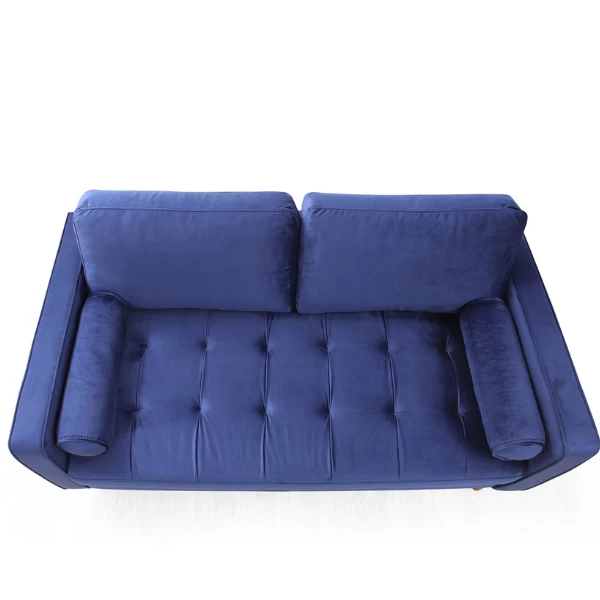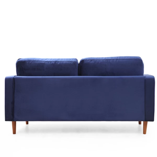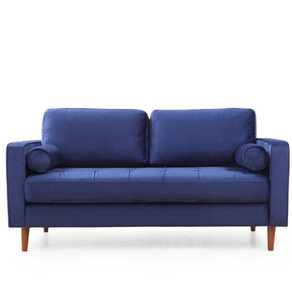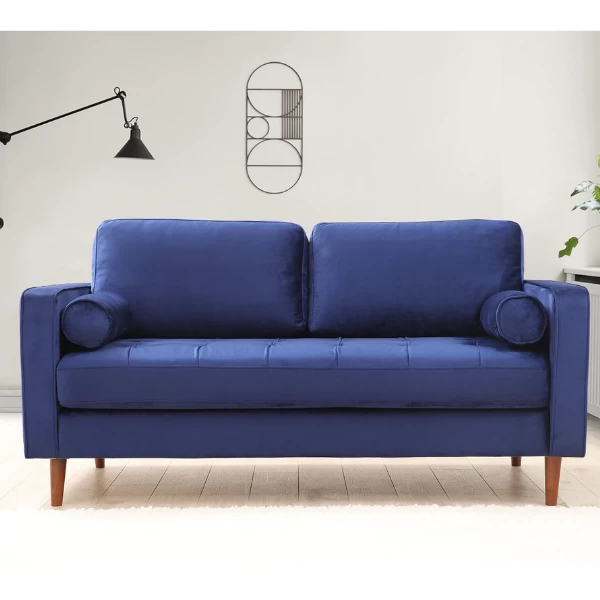 Sofa met 2 zitplaatsen | Comfortabel en stijlvol, deze sofa heeft een beukenhouten frame, polyester stof en walnoothouten poten. Inclusief 2 kussens voor extra ondersteuning. Marineblauwe kleur