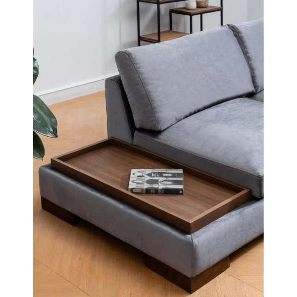 Hoekbank | Comfortabel en stijlvol middelpunt voor je woonkamer. Gemaakt met een beukenhouten frame en 100% polyester stof. Inclusief 2 kussens en walnoothouten poten. Donkergrijze kleur. Hoogte: 80cm. Lengte: 313 x 193cm. Breedte: 97cm. Chemisch te reinigen stof. Poef niet inbegrepen
