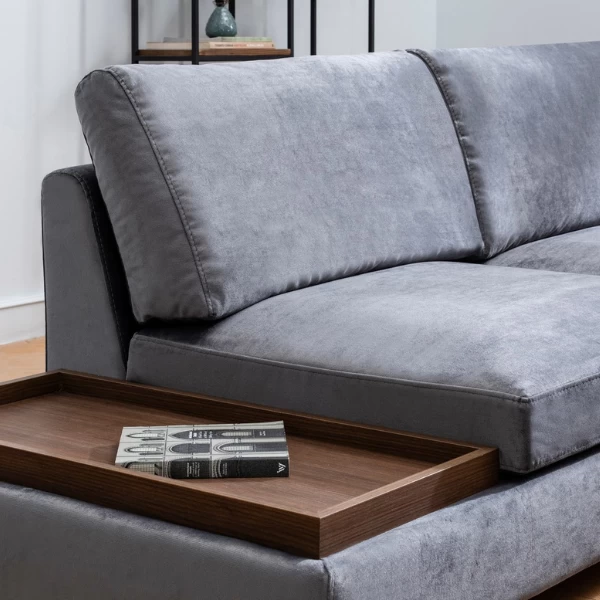 Voeg een vleugje stijl en comfort toe aan je woonkamer met onze hoekbank. Dit prachtige meubelstuk is ontworpen om de ster van je ruimte te zijn en biedt zowel comfort als een uniek ontwerp dat indruk zal maken op je gasten. Of je nu een feestje geeft of gewoon ontspant na een lange dag, deze hoekbank is de perfecte toevoeging aan je huis.Een van de belangrijkste kenmerken van onze hoekbank is de hoogwaardige constructie. Het frame is gemaakt van duurzaam beukenhout en spaanplaat, zodat hij jarenlang bestand is tegen dagelijks gebruik. De stof is 100% polyester, waardoor hij zacht en luxueus aanvoelt. Met een lengte van 313 cm en een breedte van 193 cm biedt deze hoekbank voldoende zitruimte voor jou en je gasten. De hoogte van 80 cm zorgt ervoor dat je comfortabel kunt zitten en ontspannen zonder een benauwd gevoel te krijgen. Het schuim dat in de bank wordt gebruikt is van de hoogste kwaliteit, met een dichtheid van 28 DNS voor het zachte grijze schuim dat wordt gebruikt voor het zitten, en 24 DNS veren voor extra comfort. De rugkussens zijn gemaakt van een combinatie van 60% snipperschuim en 40% siliconenschuim, voor optimale ondersteuning met behoud van een pluche gevoel.We begrijpen het belang van maatwerk, daarom hebben we 2 kussens bij de bank geleverd. Deze kussens zijn gemaakt van hetzelfde hoogwaardige schuim als de rugkussens en bieden extra comfort en ondersteuning. De kussens zelf zijn gemaakt van een combinatie van 60% snipperschuim en 40% siliconenschuim. Als je de voorkeur geeft aan een andere vorm of maat, kan het draagbare zit-/rugkussen eenvoudig worden herschikt om aan je voorkeuren te voldoen.De poten van de Hoekbank zijn gemaakt van walnoothout, wat een vleugje elegantie toevoegt aan het algehele ontwerp. Deze poten zijn stevig en betrouwbaar, zodat je bank stabiel blijft tijdens het gebruik. Let op: de poef is niet inbegrepen bij de bank, zodat je de flexibiliteit hebt om desgewenst voor extra zitopties te kiezen.Qua kleur is de Corner Sofa verkrijgbaar in een rijke en verfijnde donkergrijze kleur. Deze kleur is tijdloos en veelzijdig, waardoor hij gemakkelijk te combineren is met een bestaande inrichting of een opvallende verschijning is in je woonkamer.Over het geheel genomen biedt de Corner Sofa een winnende combinatie van stijl, comfort en duurzaamheid. De hoogwaardige constructie en aandacht voor detail onderscheiden hem van andere banken op de markt. Als je je woonkamer een update wilt geven