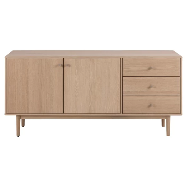 De meubelstukken uit de Aston-collectie passen door hun lichte kleuren en strakke lijnen perfect in een Scandinavisch interieur. Ze zijn gemaakt uit spaanplaat met een decor in witte eik. De lage pootjes (20cm) zijn gemaakt uit eikenhout. Dressoir Aston is voorzien van 2 deuren, 2 legplanken en 3 lades. Er is dus voldoende plaats om je spullen in op te bergen.