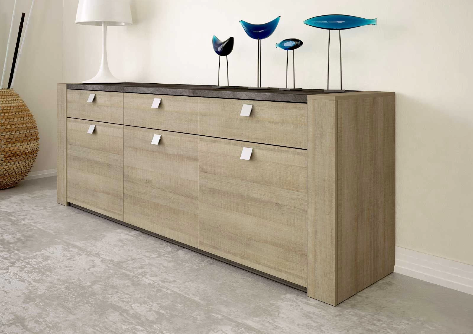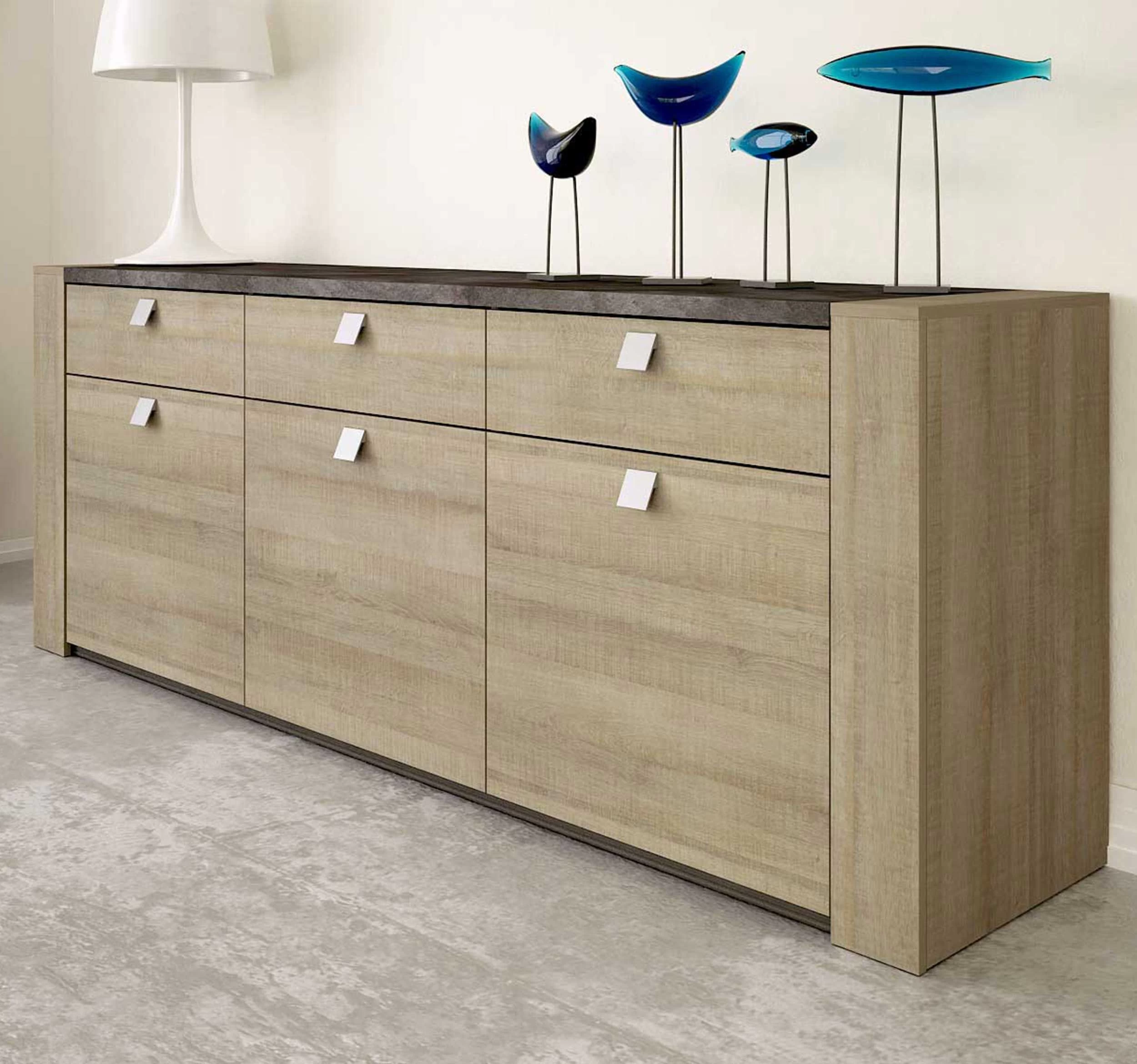Deze dressoir bestaat uit 3 laden en 3 deuren met daarachter telkens een legplank. De kast is gemaakt van spaanplaat en werd afgewerkt in hoogwaardig melamine.