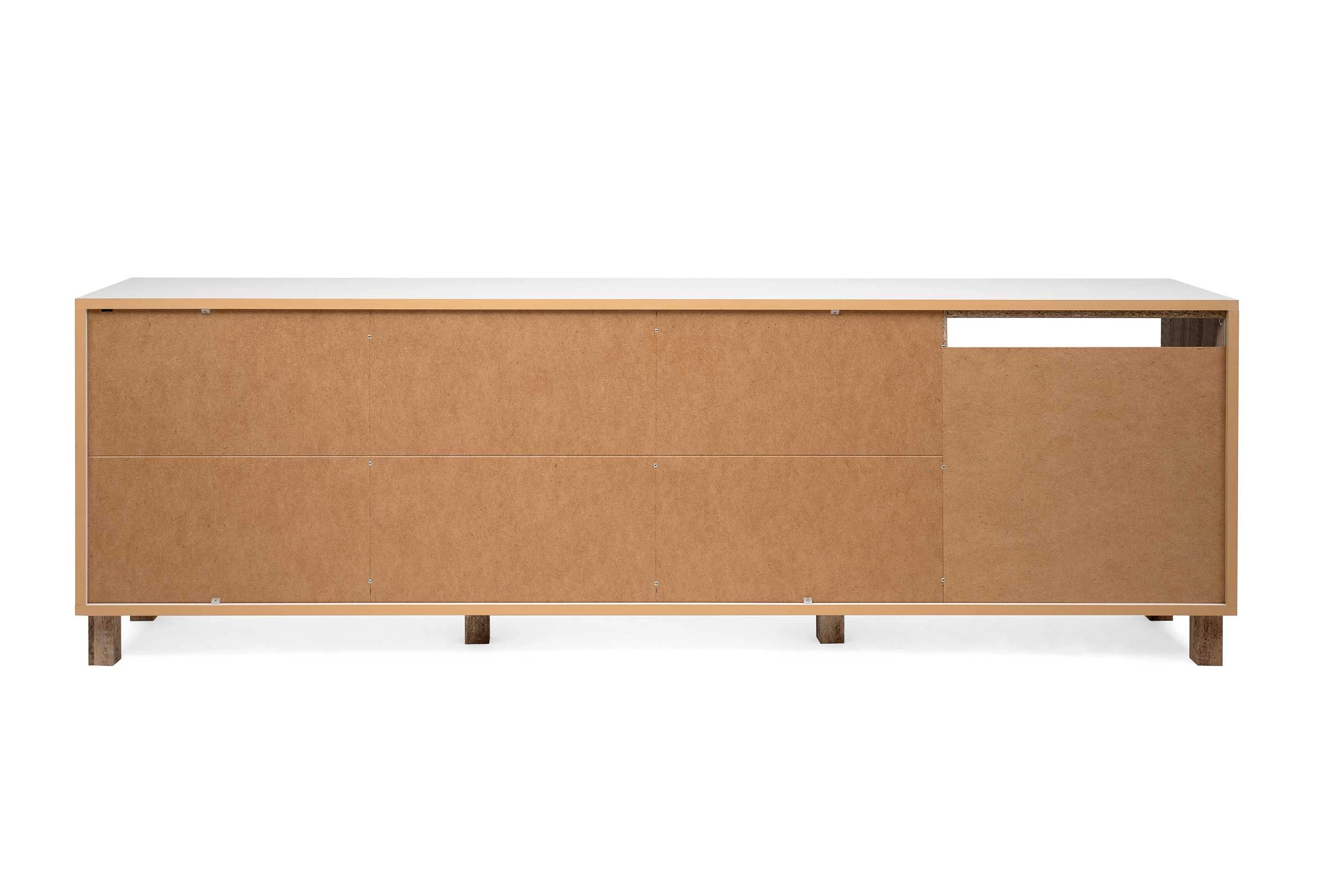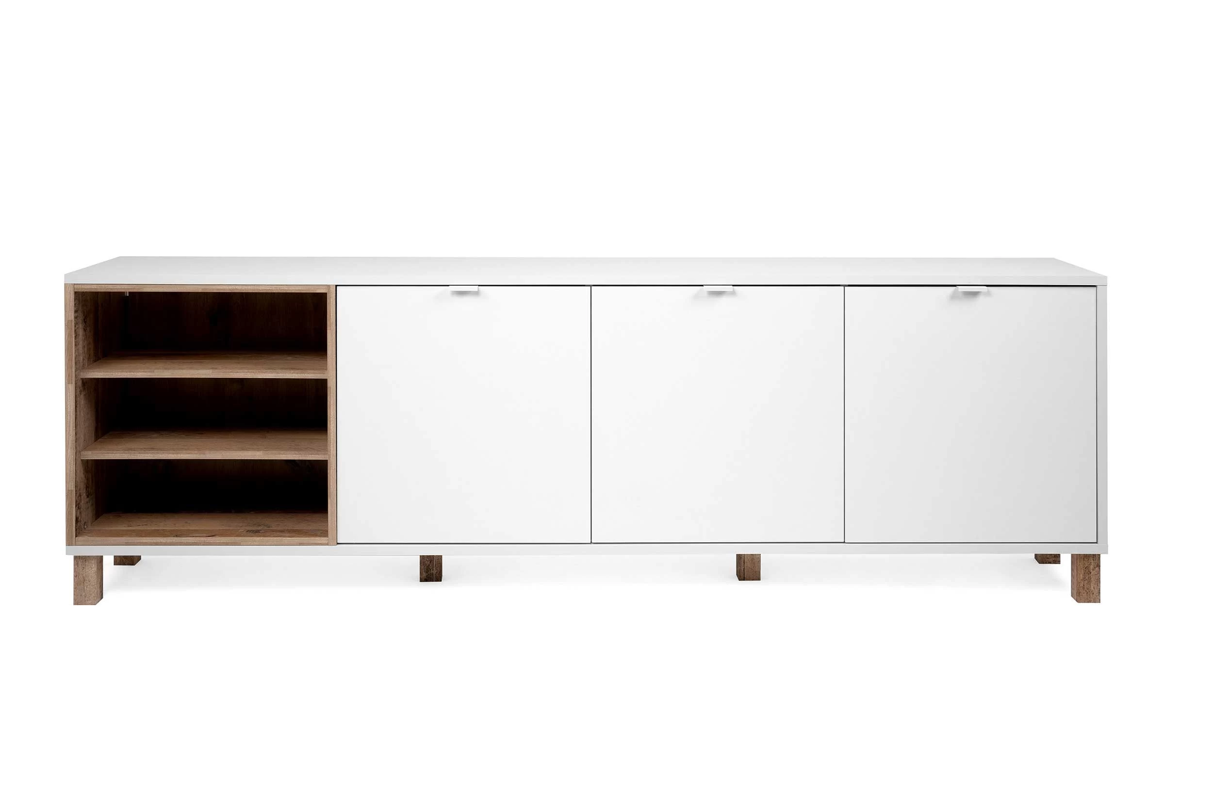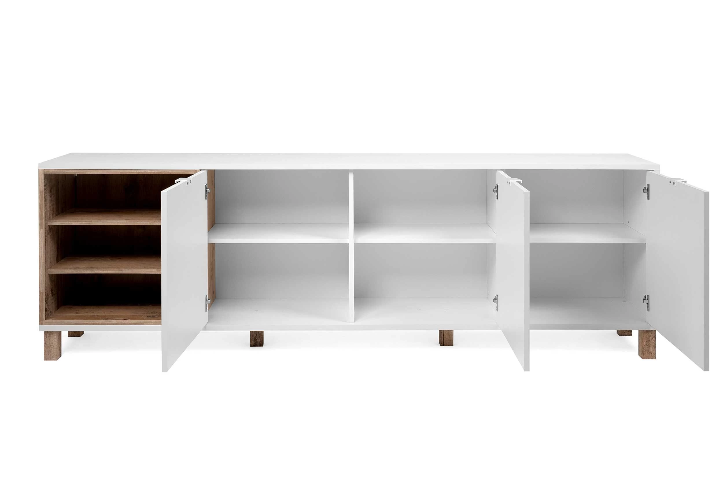 Dressoir Mercos, gemaakt uit spaanplaat in wit en 1 accentcompartiment in old style. Uitgerust met 3 deuren en 5 legplanken.