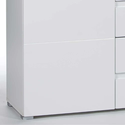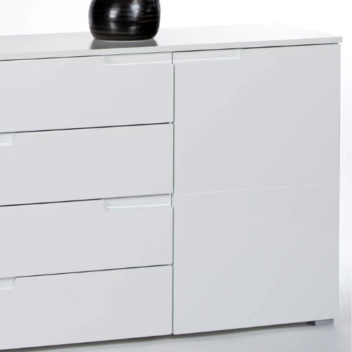 Dressoir Peso met 2 deuren en 4 lades. Gemaakt uit witte MDF, voorkant afgewerkt in hoogglans.
