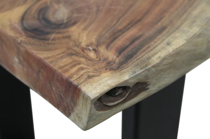 massief acaciahouten zitvlak en zwart gepoedercoat frame. Het hout heeft een