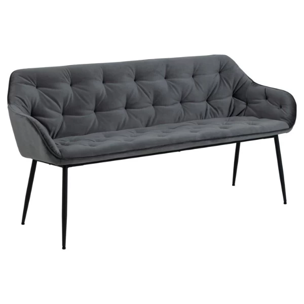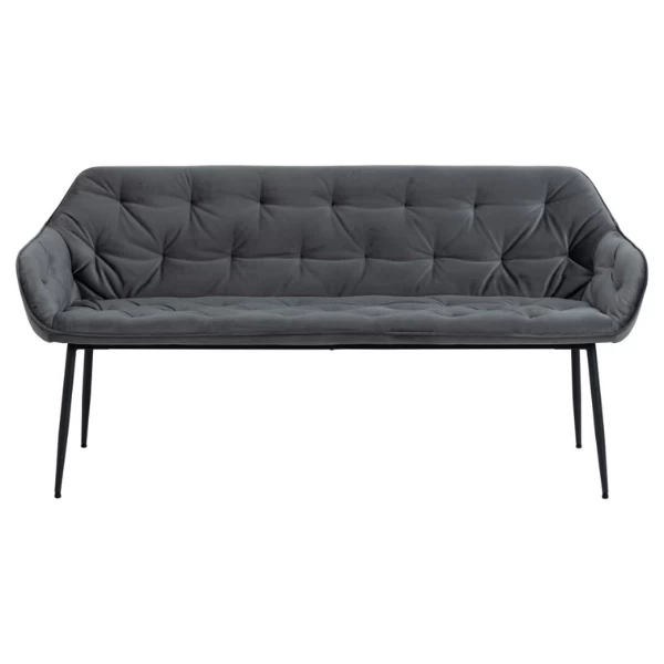 Trendy eetkamerbank Brooke heeft een zitting en rugleuning die gecapitonneerd zijn. Hierdoor heeft de bank een luxe uitstraling. De donkergrijze kleur draagt er dan weer toe bij dat deze bank een tijdloos stuk is dat in elke interieur past. Eetkamerbank Brooke heeft matzwarte poten en is 167 cm lang. Het zitoppervlak is 130 cm lang. Er is dus meer dan voldoende plaats voor 2 volwassenen of 3 tot 4 kinderen.