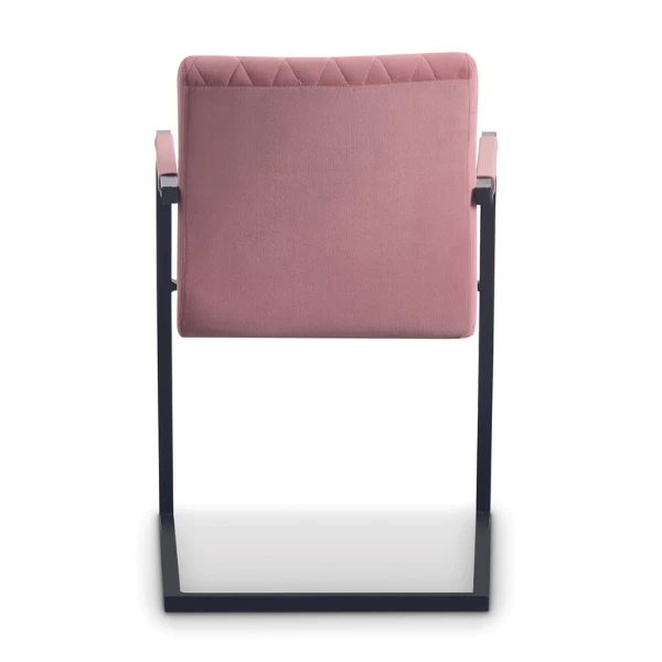 Eetkamerstoel Britt heeft een bekleding in roze velours en heeft zwarte metalen sledepoten.