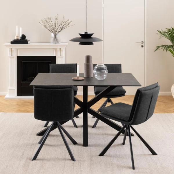 Naast de prachtige esthetiek biedt de Flynn eetkamerstoel ook buitengewoon comfort. De beklede zitting en rugleuning bieden pluche ondersteuning en stimuleren een optimale houding, zelfs tijdens lange diners of bijeenkomsten. Het 4-sterren onderstel biedt stabiliteit en veiligheid, zodat je kunt ontspannen en genieten van je maaltijden.
