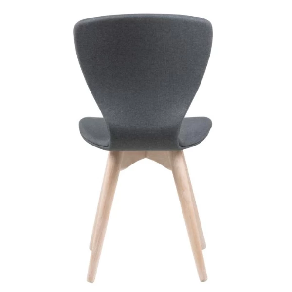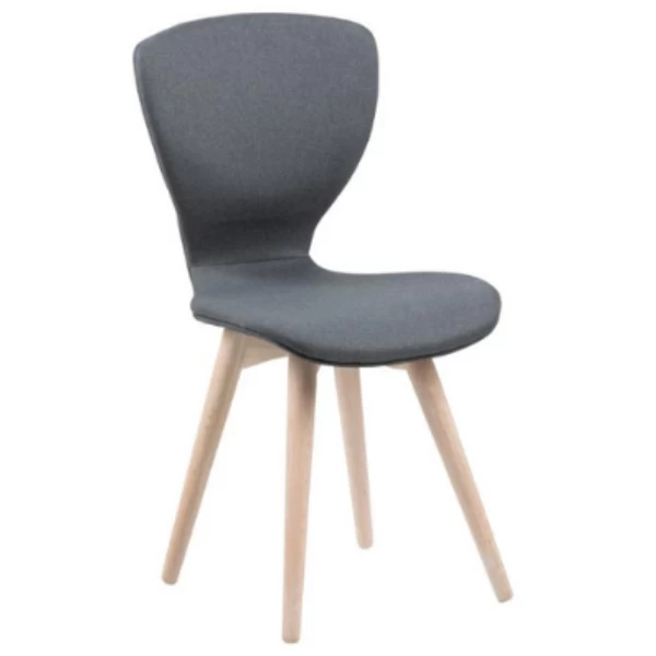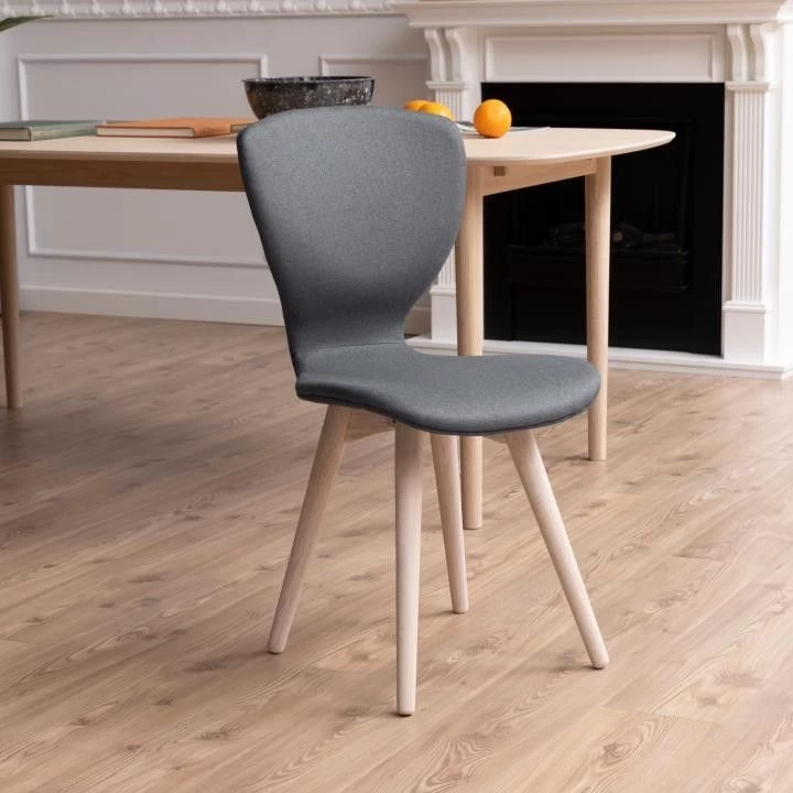 Nordische eetkamerstoel Gogel in donkergrijze stof en poten uit wit gepigmenteerd eikenhout.