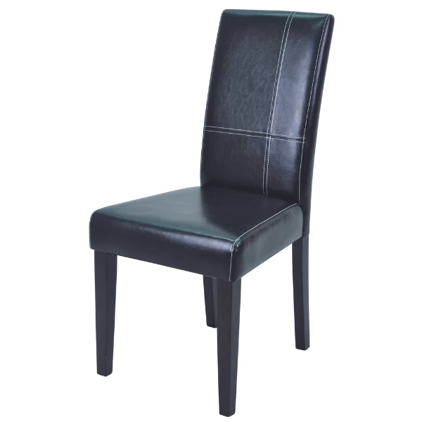 Eetkamerstoel Gust heeft een bekleding in glanzend zwart polyurethaan gevuld met schuim. De poten en de structuur van de rugleuning zijn uit dennenhout en de structuur van de zitting is uit dennenhout en gelijmd laminaat.