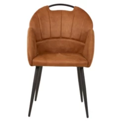Bent u nog op zoek naar stoelen om uw eetkamer te vervolledigen? Bekijk dan zeker onze eetkamerstoelen Lori. Deze stoel bestaat uit zwarte metalen poten en is bekleed in cognackleurig kunstleer. De kuipvorm geeft de stoel niet alleen een leuke retro-uitstraling, maar zorgt ook voor meer zitcomfort. Ideaal voor lange avonden aan tafel. Deze stoel bestaat ook in een uitvoering in taupe.