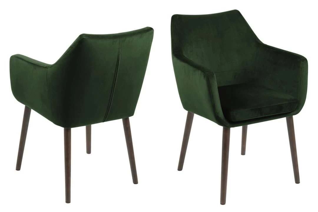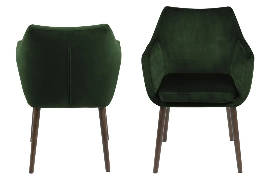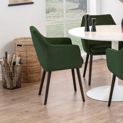 Eetkamerstoel Noria, gemaakt uit massief eikenhout en bekleed met donkergroene VIC stof.
