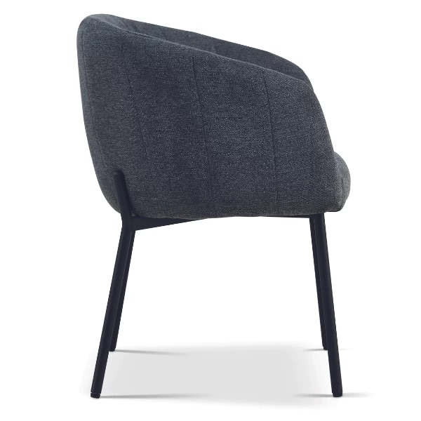 Eetkamerstoel Sill heeft een donkergrijze stoffen bekleding en zwarte metalen poten.