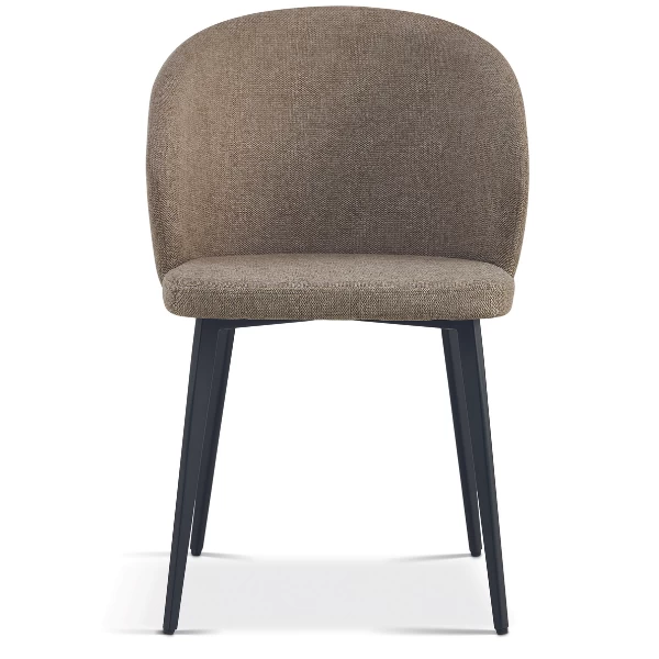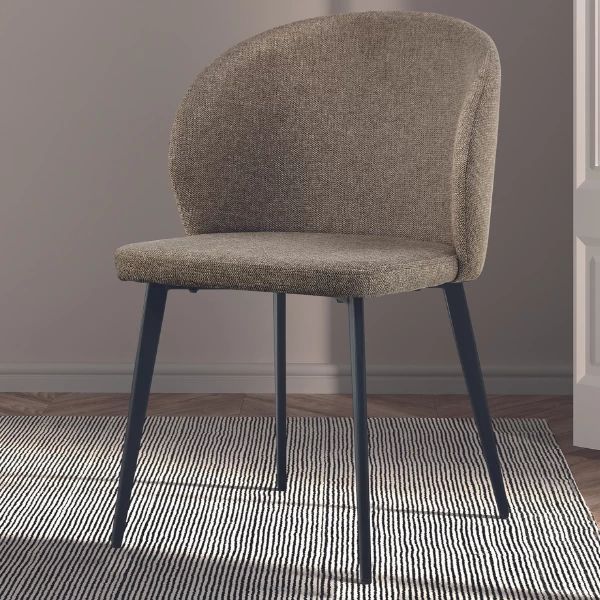 Eetkamerstoel Tilly heeft een stoffen bekleding en zwarte metalen poten.