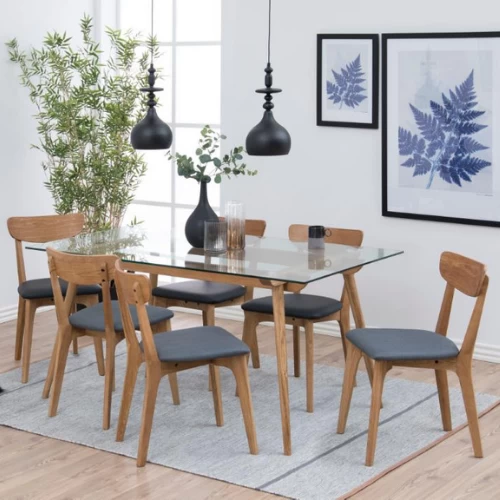 Versterk het gevoel van warmte en gezelligheid in de eethoek met deze eetkamerstoel. Geïnspireerd door de Scandinavische esthetiek, weerspiegelt hij een evenwichtige mix van een eenvoudig silhouet, natuurlijk eikenhout en een duurzame donkergrijze stof. Dit ontwerp past dan ook in elke keuken. Om het nodige comfort te garanderen, moedigen de beklede zitting en de gebogen rugleuning je aan om op een natuurlijke manier te zitten. Het stevige frame kan tot 110 kg dragen.