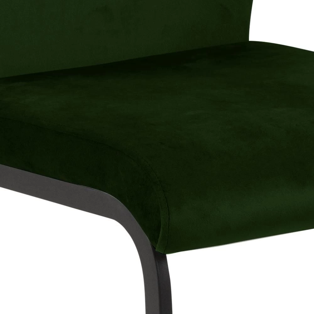 Eetkamerstoel Ulla met donkergroene bekleding en zwart gepoedercoate metalen poten. Met hoge rugleuning, handvat en sledepoten.