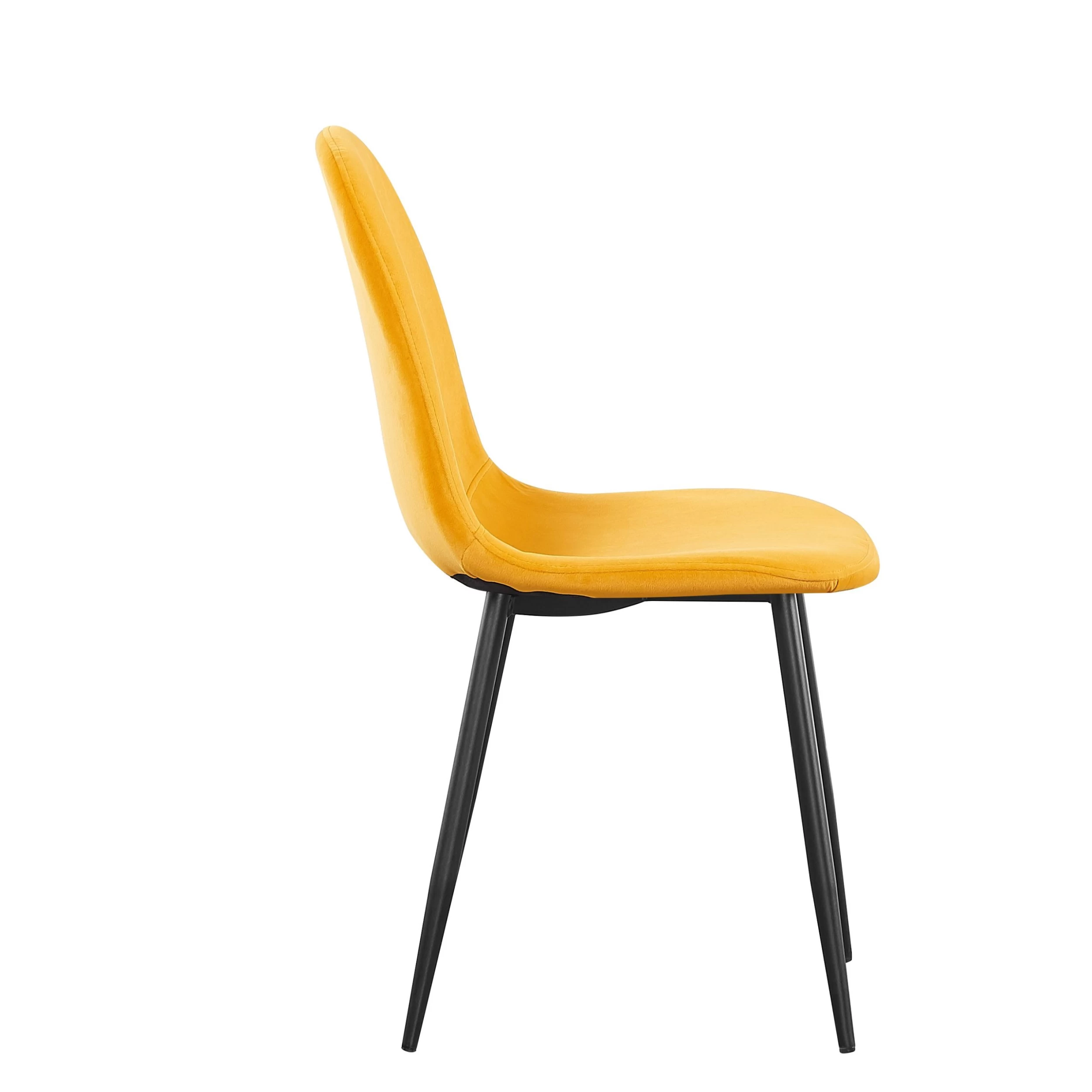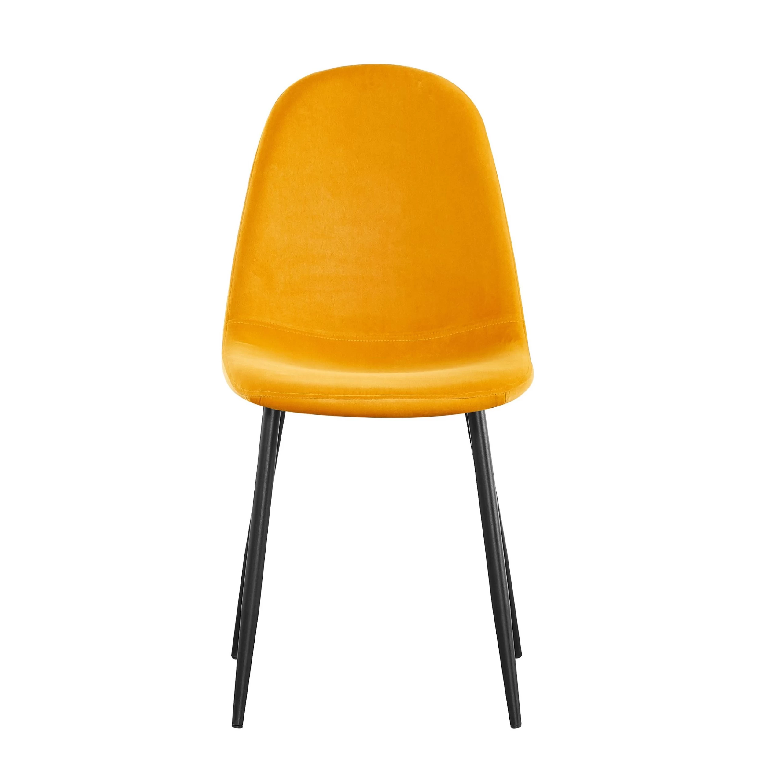 De Valeska-collectie van het merk Rousseau biedt stoelen in allerlei kleuren geschikt voor rond jouw eettafel. Deze Valeska stoel heeft zwarte metalen poten en een gele bekleding uit fluweel.