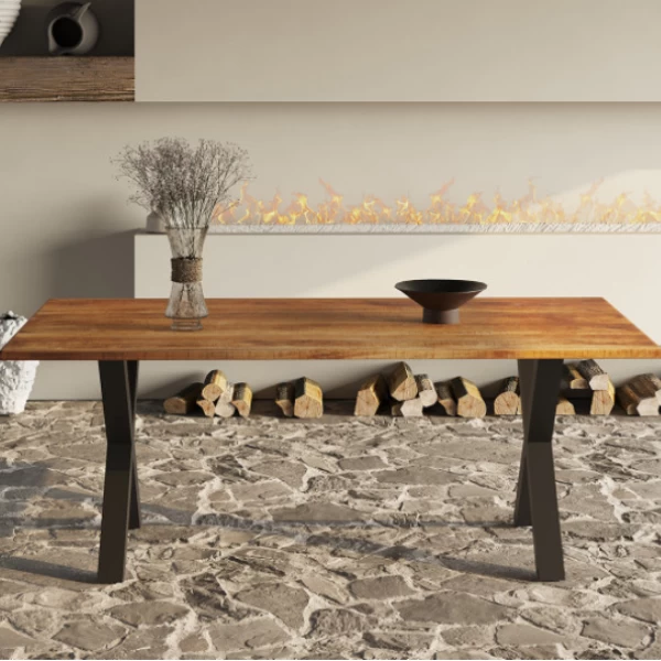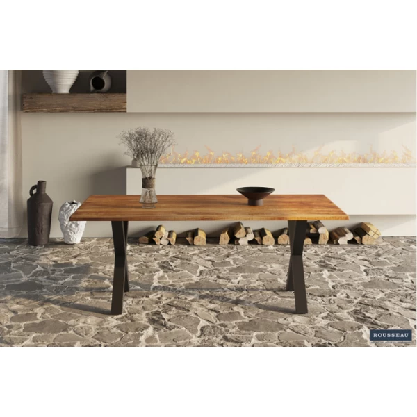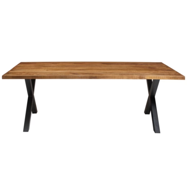 Het ruw afgewerkte blad in warm magnoliahout in combinatie met de strakke metalen X-poten geven deze tafel een stoere industriële look. Deze eettafel biedt plaats aan 8 personen en is de finishing touch in uw industriële keuken of eetkamer. De X-poten kunnen op 127 of 150,5 cm van elkaar gemonteerd worden afhankelijk van uw wensen. Bekijk gerust onze website voor mooie bijpassende stoelen.