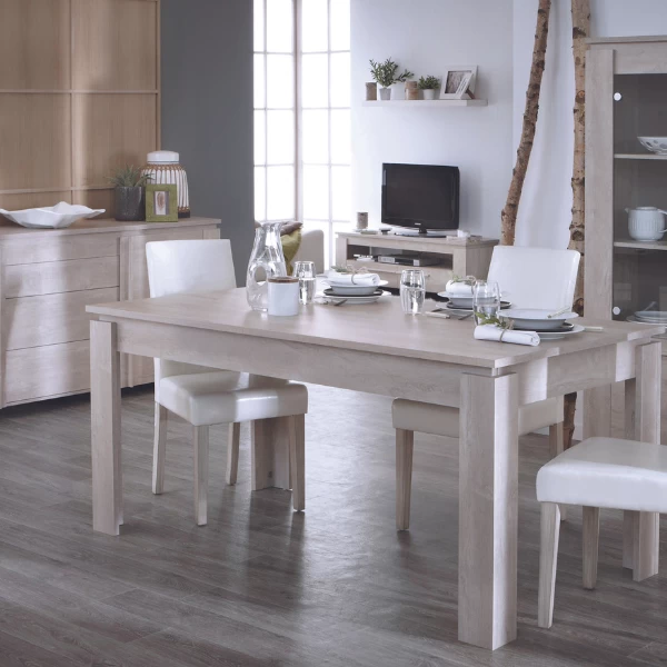 Het elegante Champagne eikdecor met ruw gezaagde uitstraling van de Samira-collectie creëert veel natuurlijke lichtinval in de woonkamer. De strakke lijnen voorzien de meubels van een eigentijdse look. Deze eettafel biedt plaats aan 6 tot 8 personen. Maak de look af door decoratie op het tafelblad te plaatsen. Ontdek ook onze andere meubelen van de Samira-collectie!