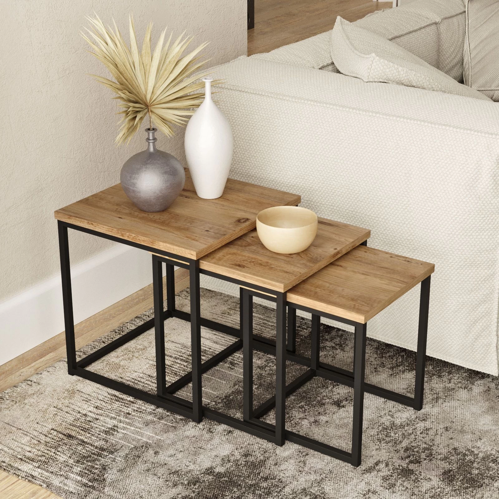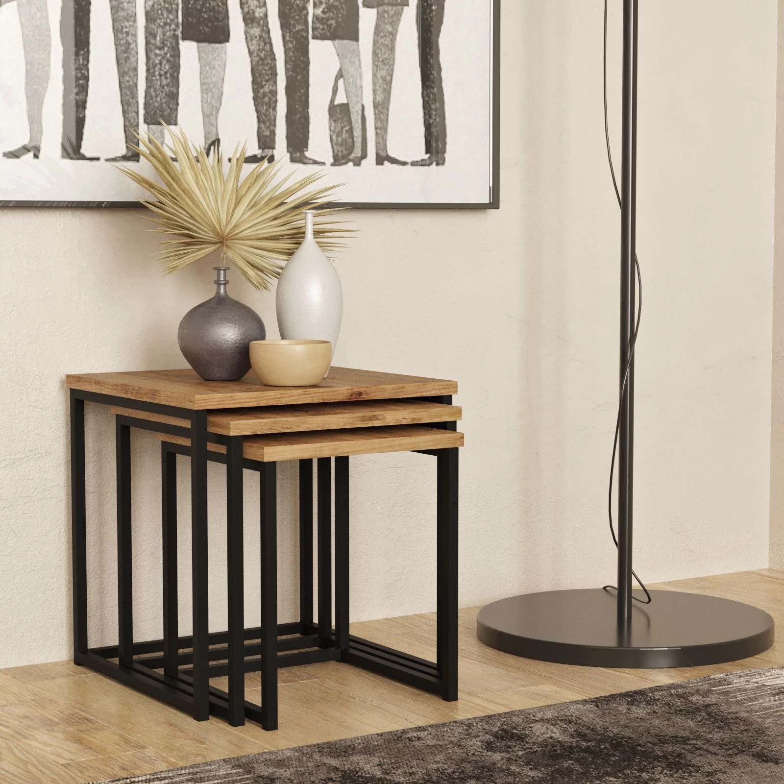 Voeg stijl en opbergruimte toe aan je kamer met deze 3-delige nesttafel set. Gemaakt van 100% gemelamineerd spaanplaat en een metalen frame voor duurzaamheid. Verkrijgbaar in Atlantic Pine