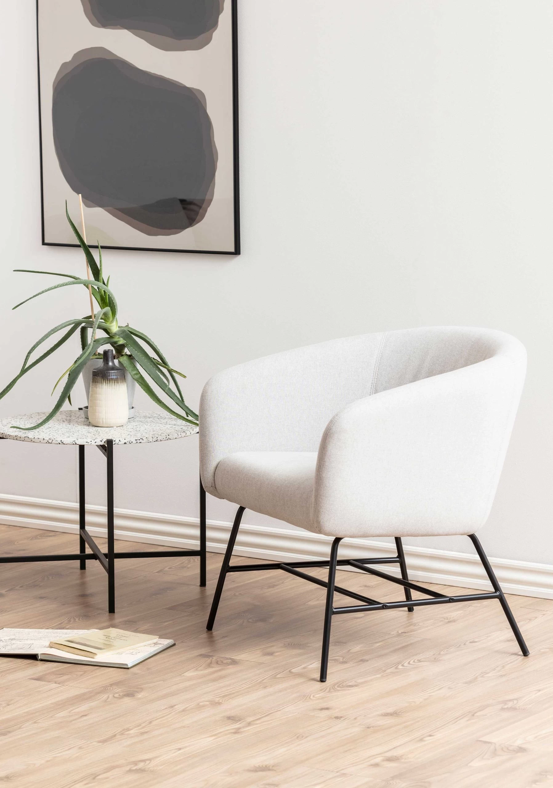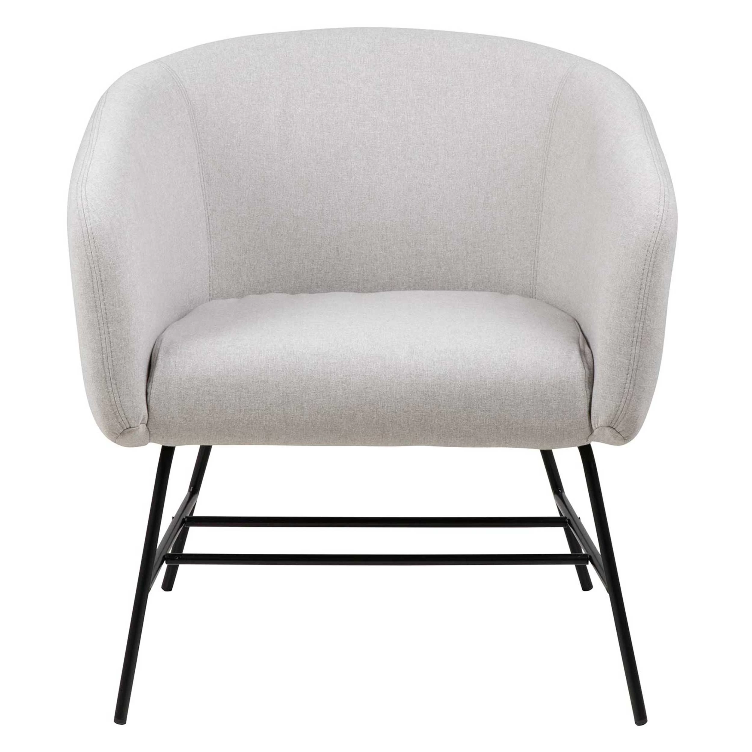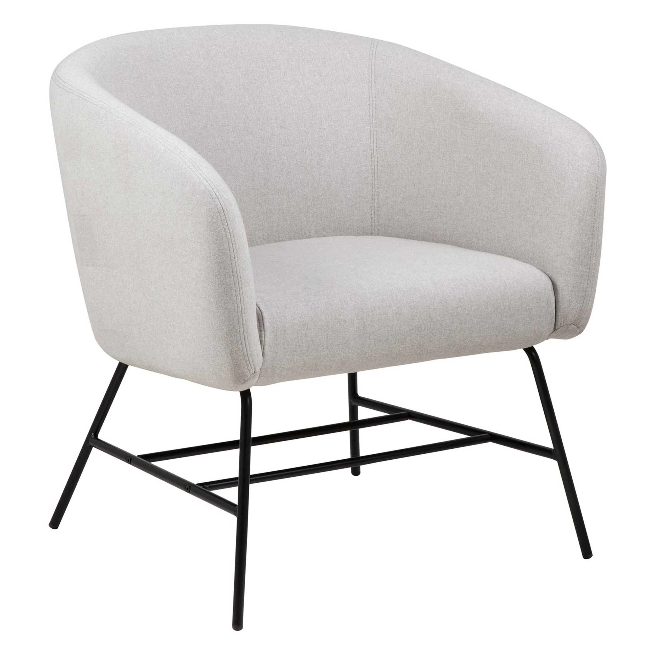 Fauteuil Aron met lichtgrijze, stoffen bekleding en mat zwart onderstel.