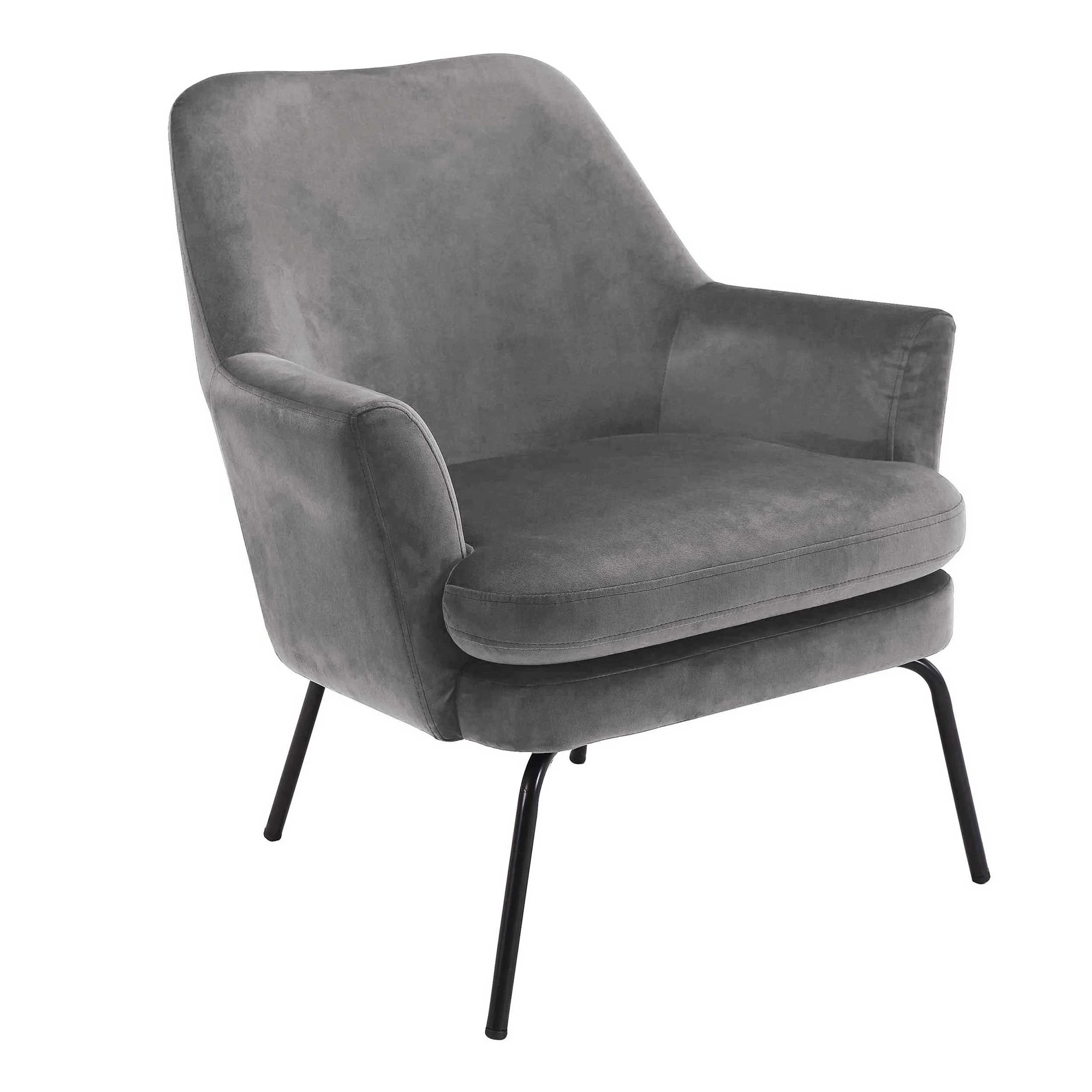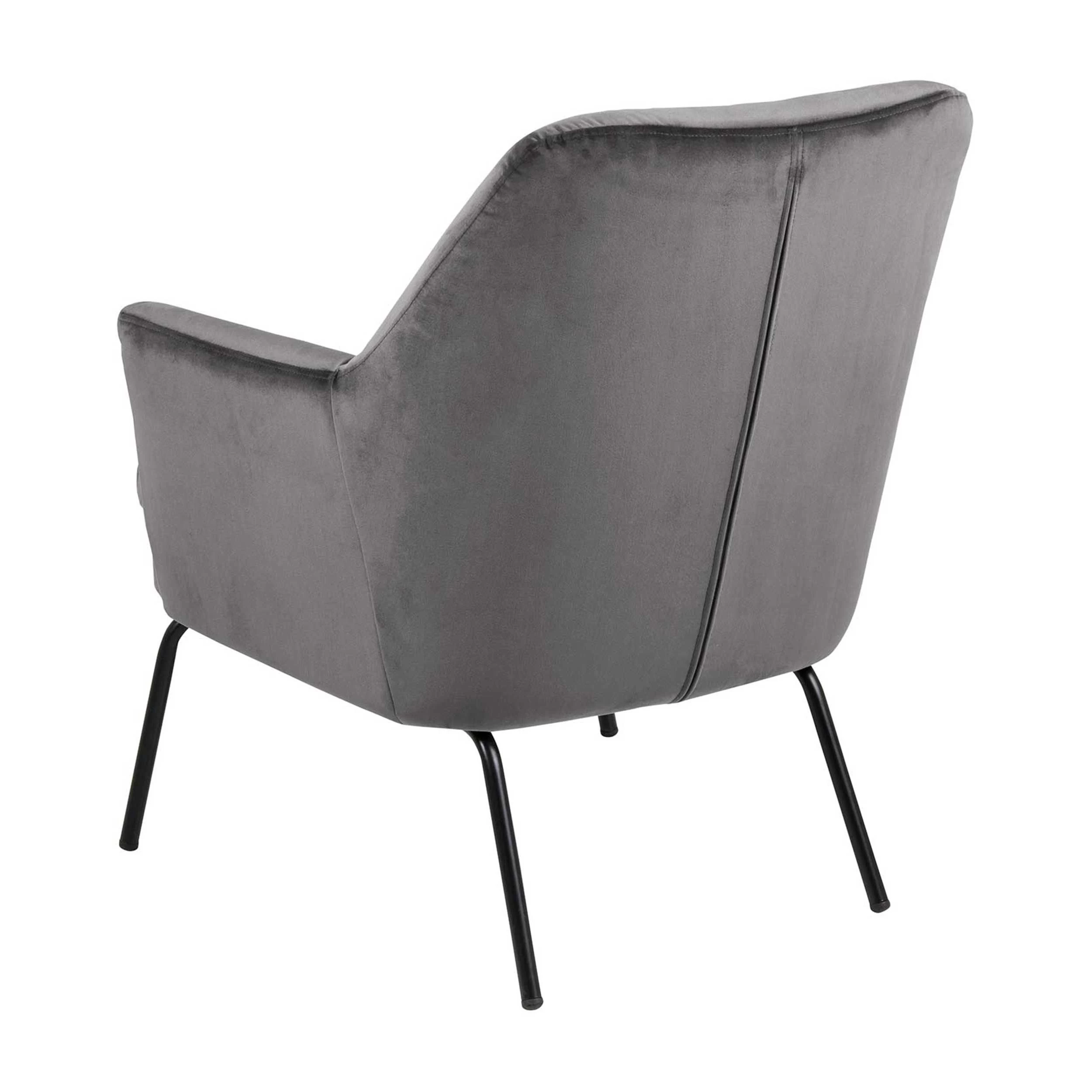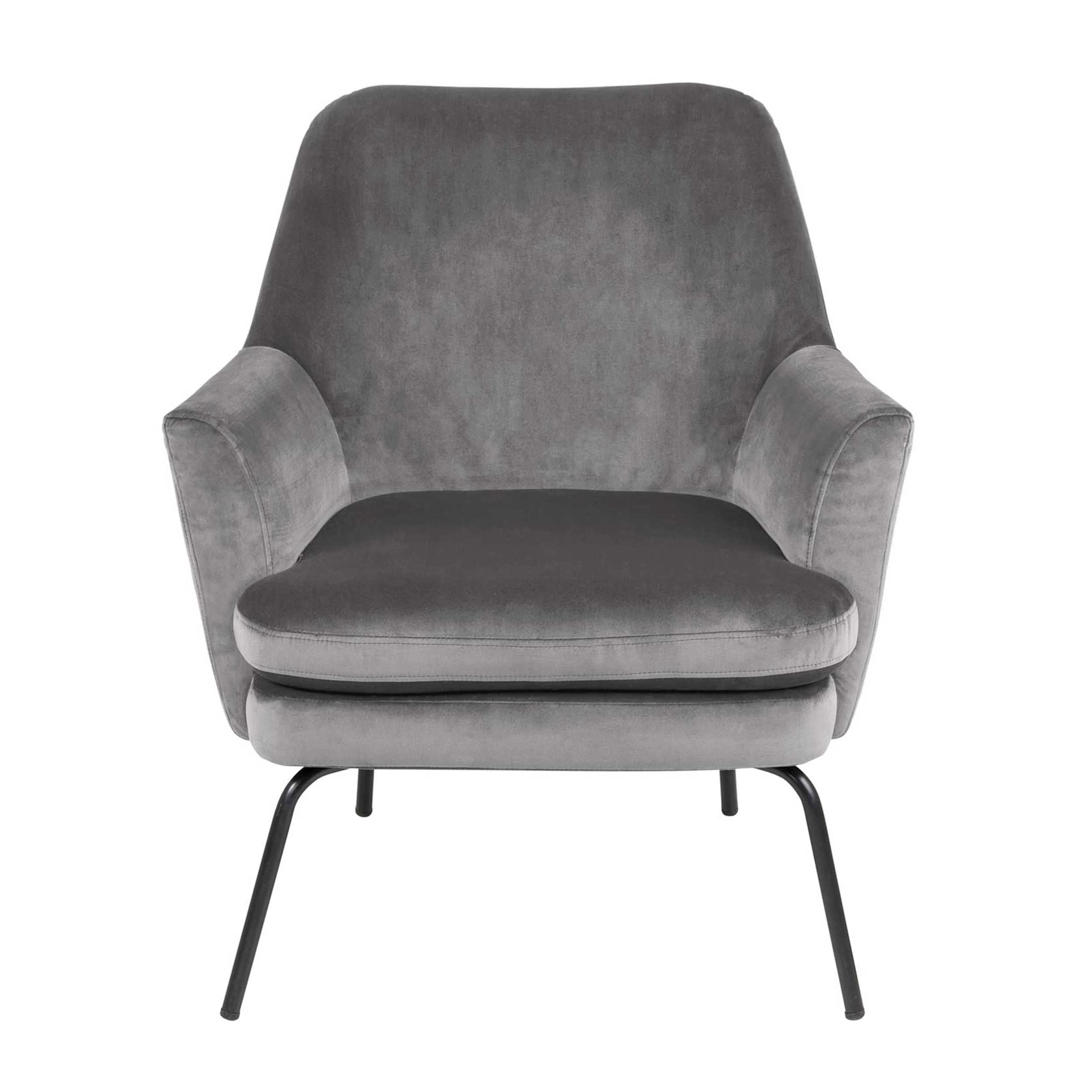 Fauteuil Sari met donkergrijze, fluwelen bekleding en zwarte poten.