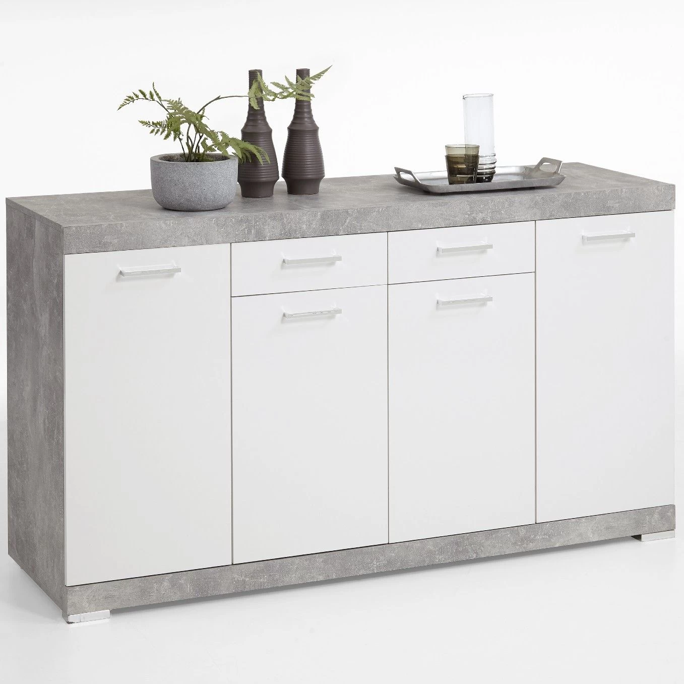 Gebrek aan opbergruimte in je eetkamer? Dat los je gemakkelijk op met de praktische dressoir Cristal. De kast is uitgerust met 2 lades en 4 deurtjes. Achter de deuren vind je binnenin telkens een legplank. Het meubel is vervaardigd uit spaanplaat met betonlook, de façades van de lades en de deuren zijn wit.
