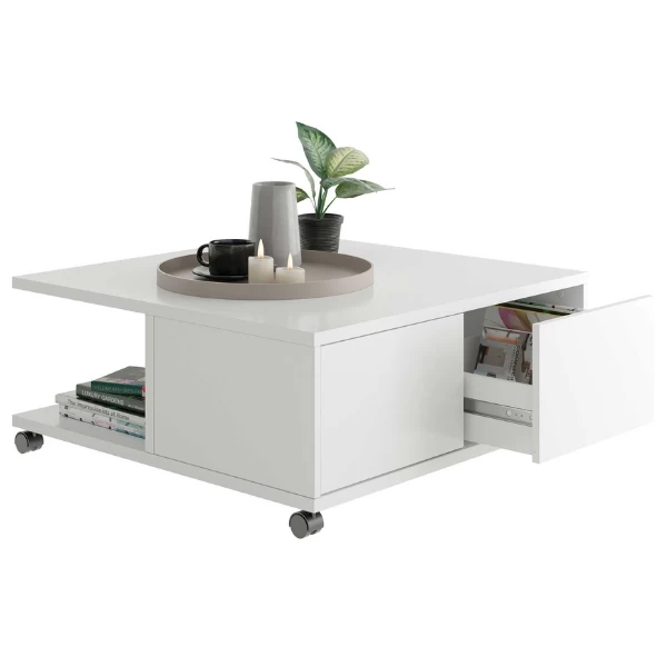 Salontafel Twiggy uit spaanplaat. Uitgerust met wieltjes en 2 lades. Witte afwerking.