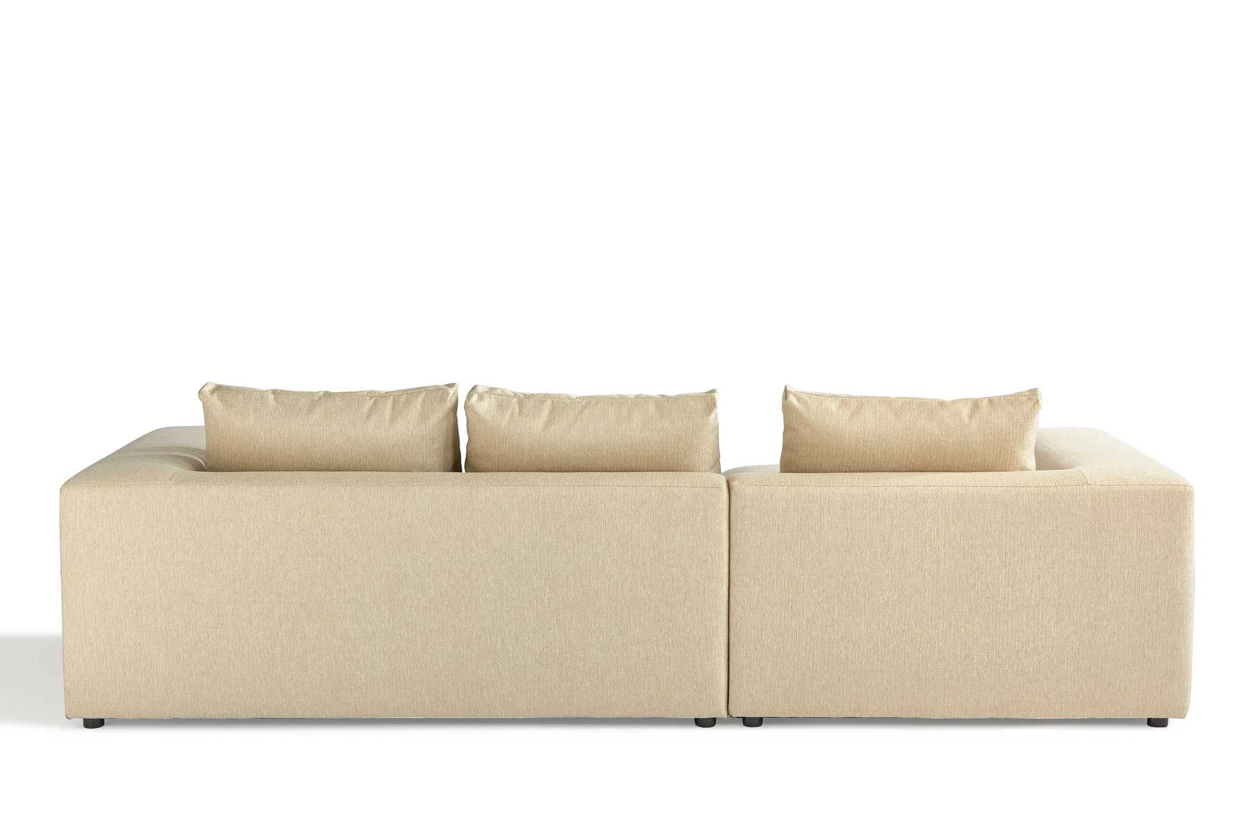 Hoekbank Videl, uitgerust met een longchair aan de linkerkant. Gemaakt uit houtvezelplaten met een bekleding uit beige stof en een vulling uit koudschuim.