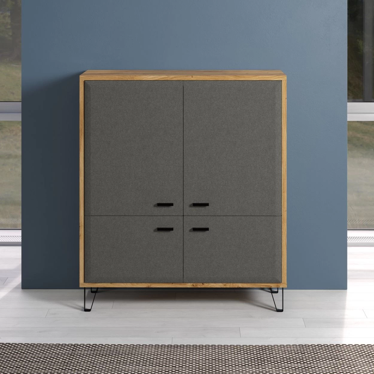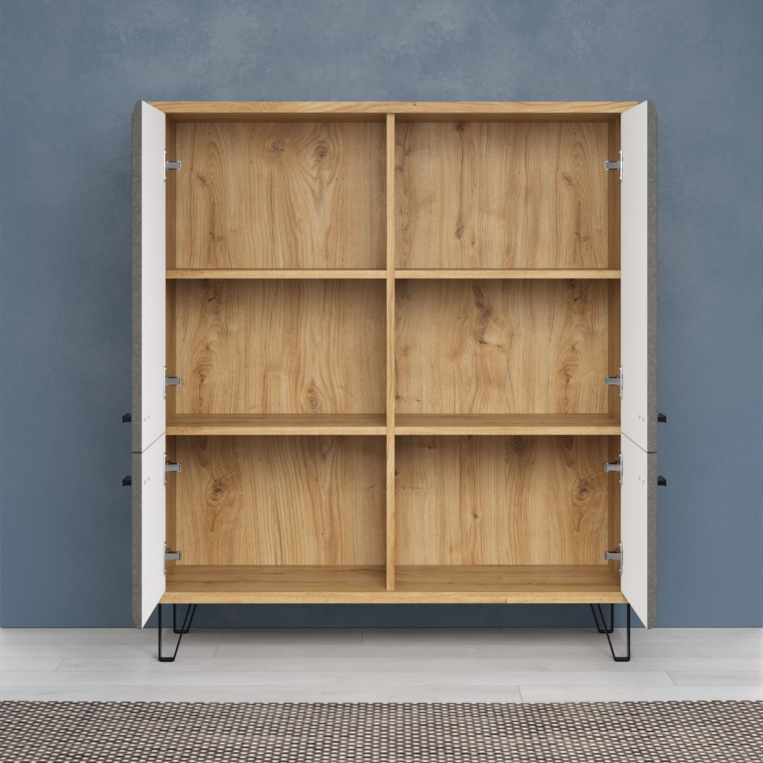 De kast Blanshe biedt niet alleen veel opbergruimte, maar voegt ook een vleugje moderne elegantie toe aan elke ruimte. De combinatie van het eiken Navarra-decor en het decoratieve vilten diepgetrokken front creëert een visueel aantrekkelijk contrast dat de algehele esthetiek van je kamer zal verbeteren.