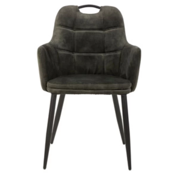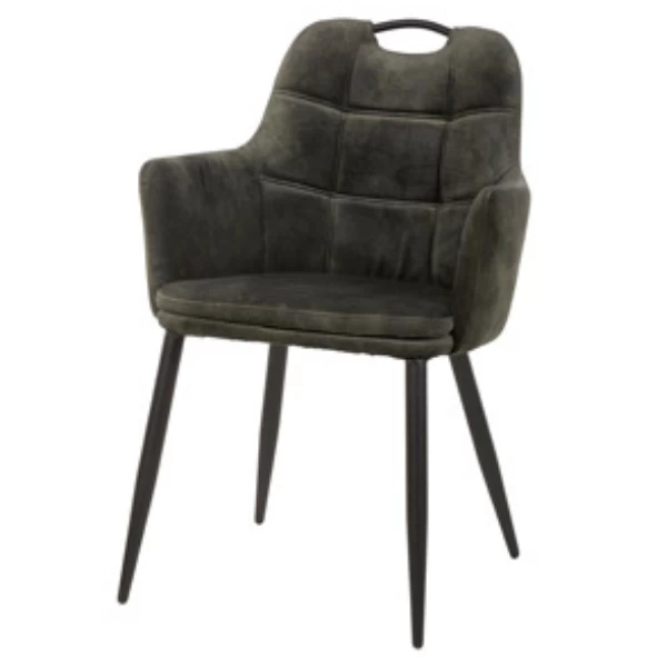 Ben je nog op zoek naar stoelen om je eetkamer te vervolledigen? Bekijk dan zeker de stoelen Rabia. De stoel bestaat uit zwarte metalen poten en is bekleed met mosgroene stof. De stoelen geven een klassevolle retro-uitstraling aan je interieur. Dankzij de kuipvorm en de armleuningen geniet je van optimaal zitcomfort. De stoel is ook verkrijgbaar met bekleding in antracietkleurige stof of cognackleurig kunstleer.