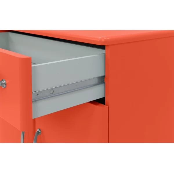 Deze ladekast is uitgerust met 5 lades. De boven- en onderkant van deze kast zijn gemaakt uit roodgelakt MDF, de zijkanten zijn gemaakt uit spaanplaat en zijn afgewerkt met een rood melaminelaagje.