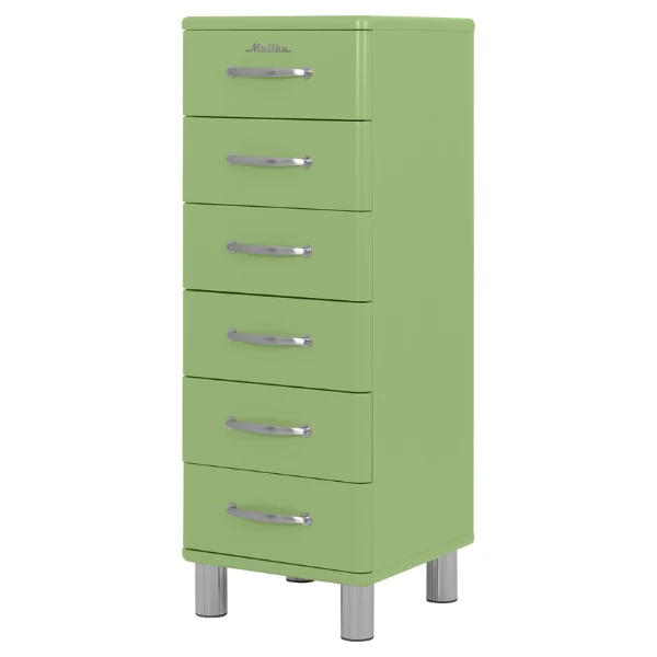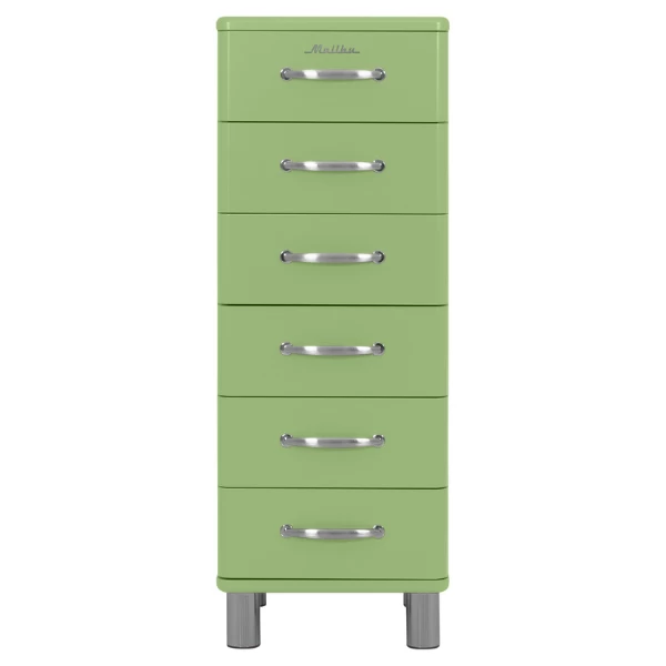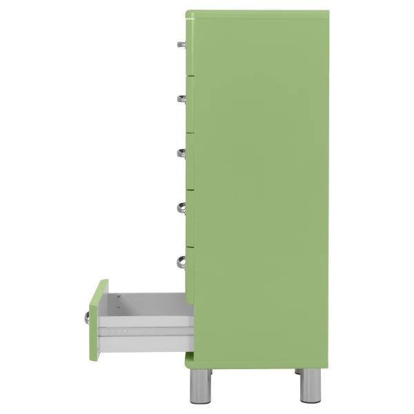 Deze ladekast is uitgerust met 6 lades. De boven- en onderkant van deze kast zijn gemaakt uit groengelakt MDF, de zijkanten zijn gemaakt uit spaanplaat en zijn afgewerkt met een groen melaminelaagje.