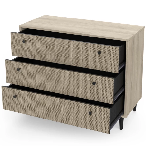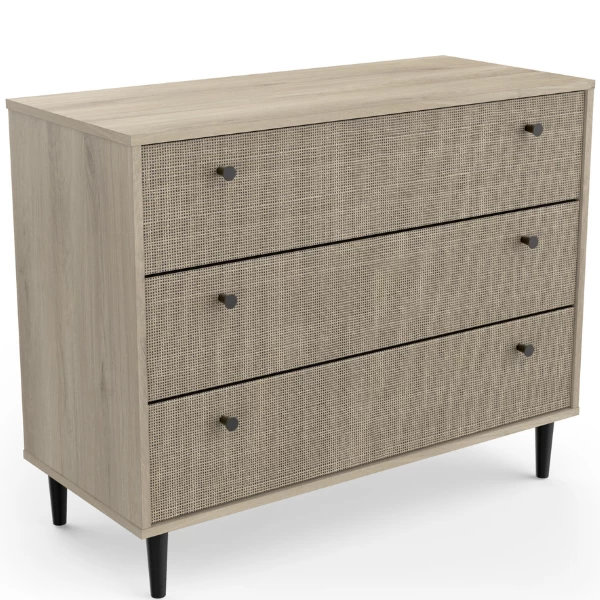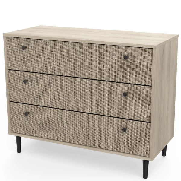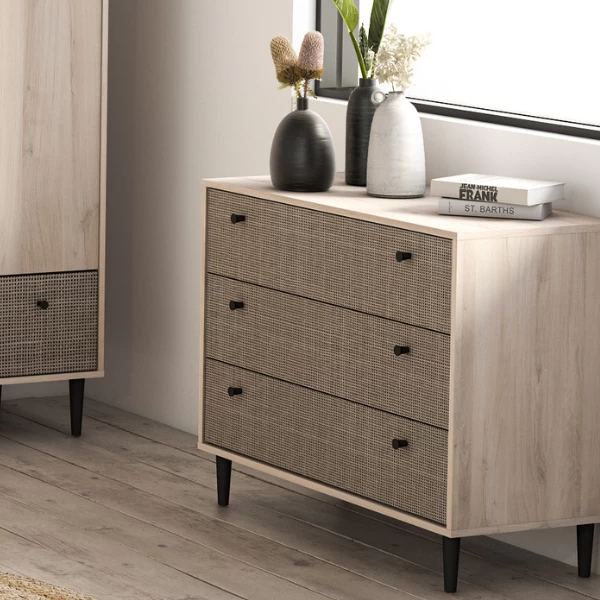 Ladekast Sayuri is gemaakt uit gemelamineerde spaanplaat in Kronberg eikdecor en wickerdecor. De kast bestaat uit 3 lades.