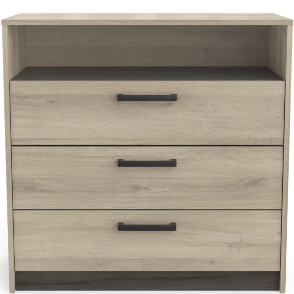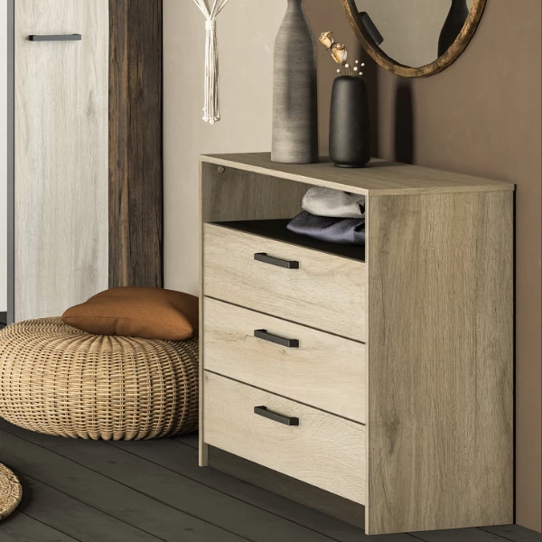 Deze ladekast in zacht Kronberg eikdecor wordt extra in de verf gezet door zijn details in het donkere Waterford eikdecor. Deze ladekast beschikt over 3 lades voor uw kousen, ondergoed en beddengoed. In het open vak kunt u eventueel nog wat boeken kwijt. Schroeven en pluggen voor wandmontage zijn niet inbegrepen.