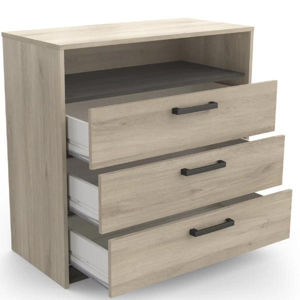 Ladekast Waylon is gemaakt uit gemelamineerde spaanplaat met Kronberg eikdecor en Waterford eikdecor. De ladekast bestaat uit 3 lades en 1 open vak.