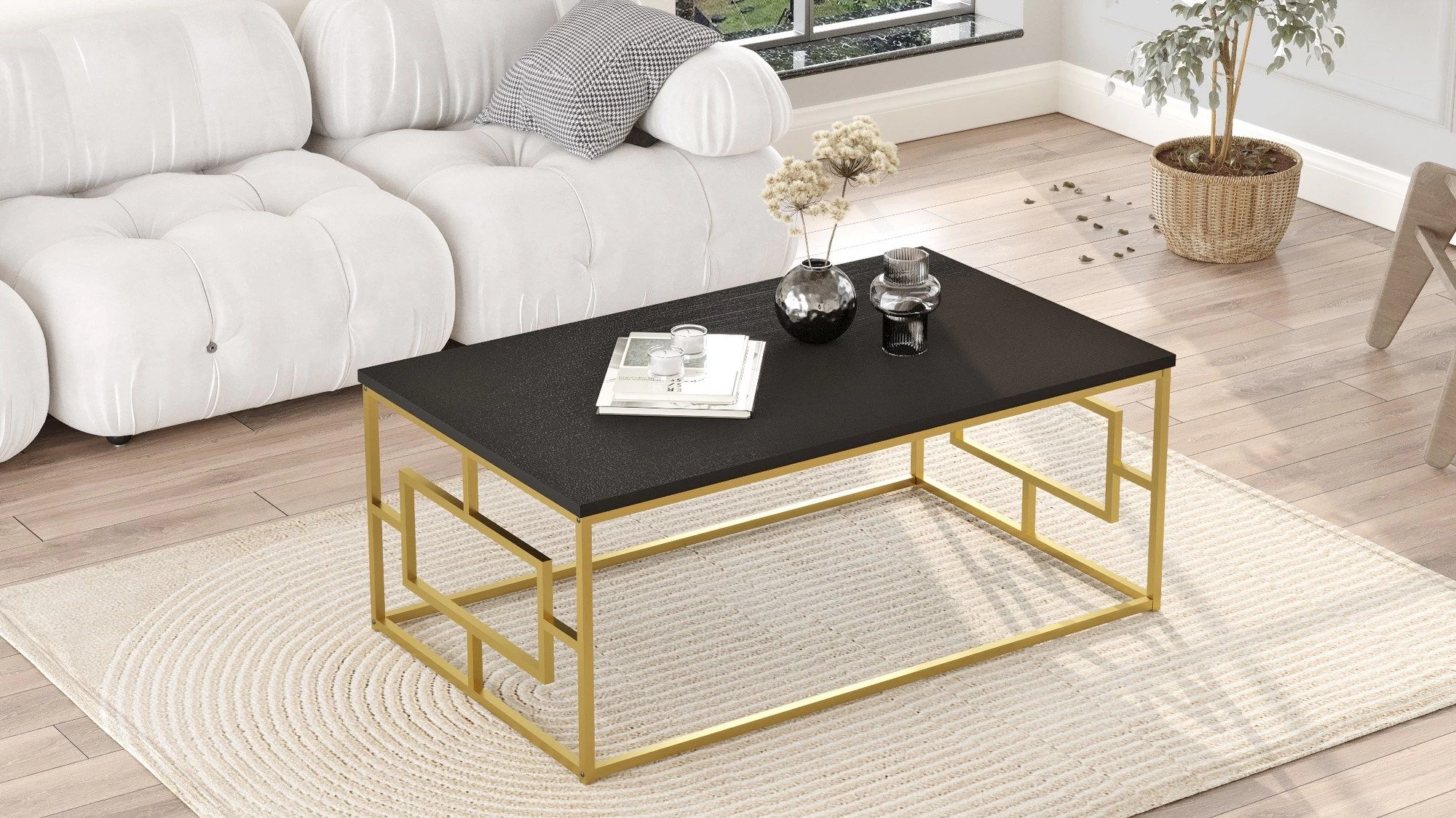 Locelso Salontafel: 100% gemelamineerd spaanplaat, 18 mm dik, zwart-gouden kleur, metalen poten. Afmetingen: 100cm x 40cm x 60cm