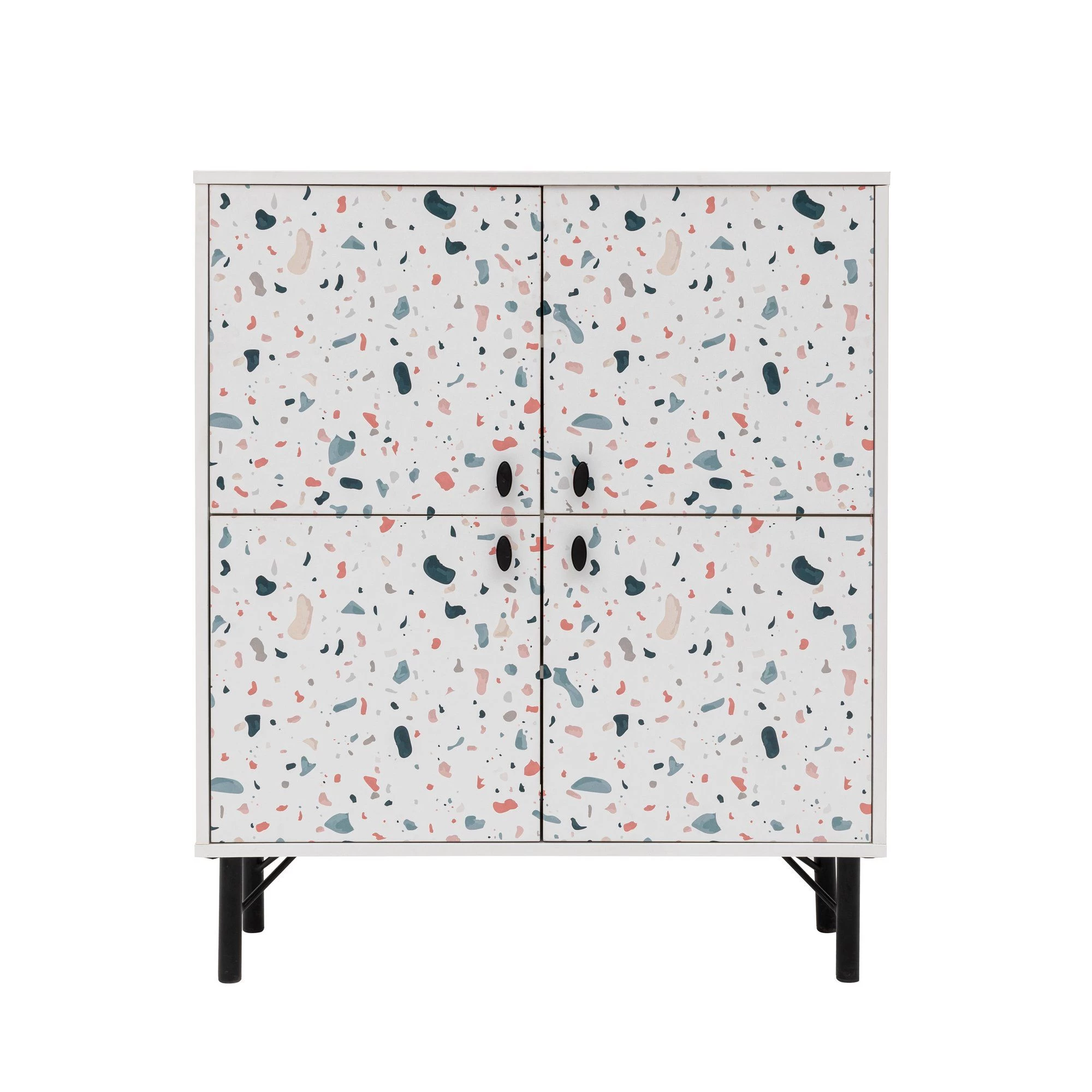 De multifunctionele kast Vella heeft 100% gemelamineerde spaanplaat, metalen poten, UV-coating en een breedte van 95 cm, hoogte van 111 cm en diepte van 36 cm. Het heeft een poothoogte van 15 cm en een veelkleurig design.