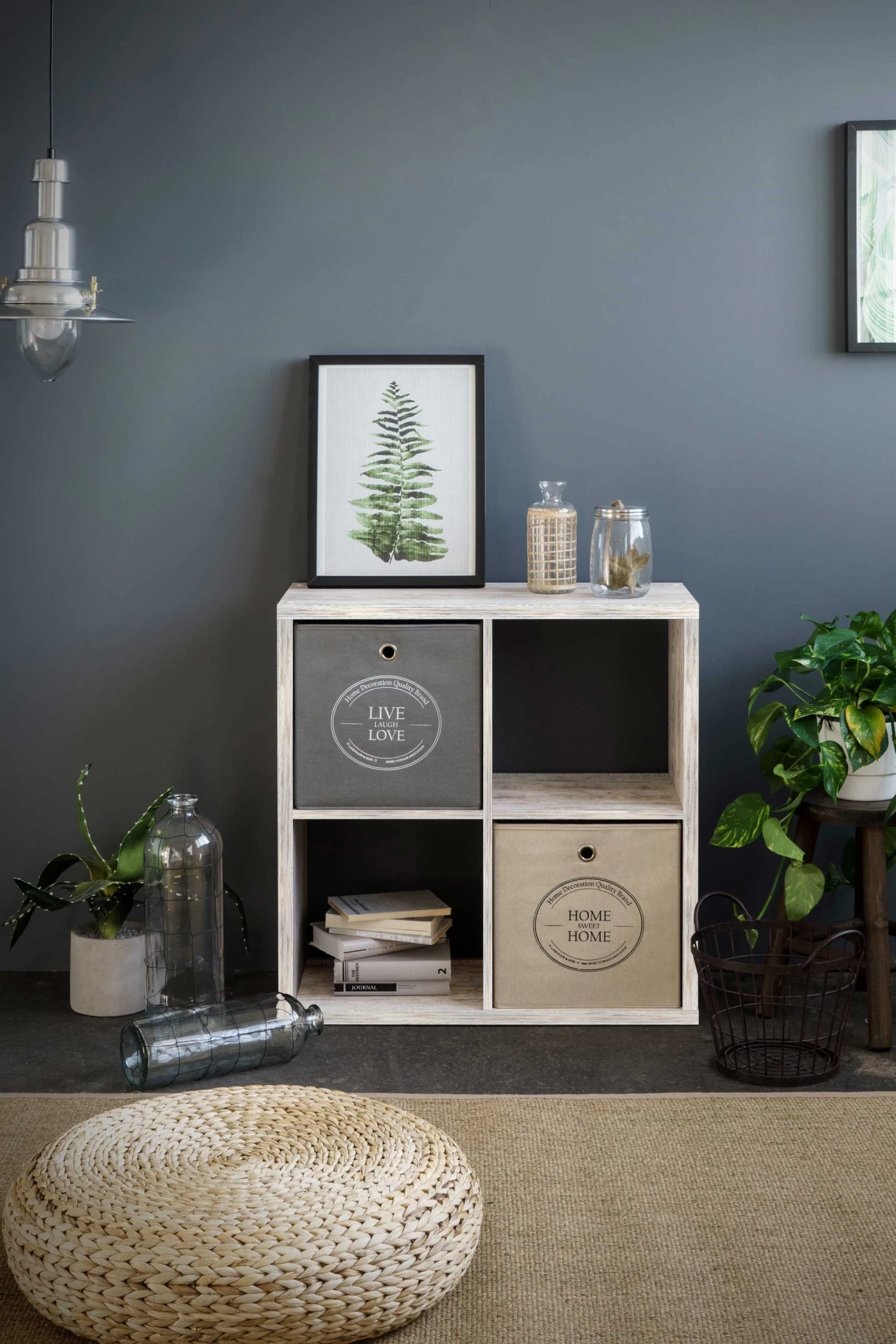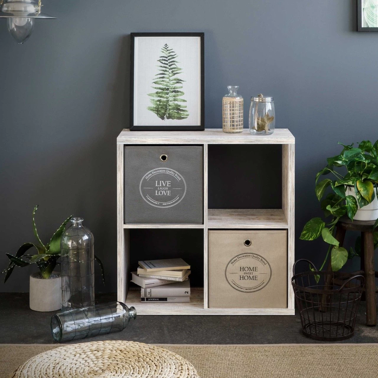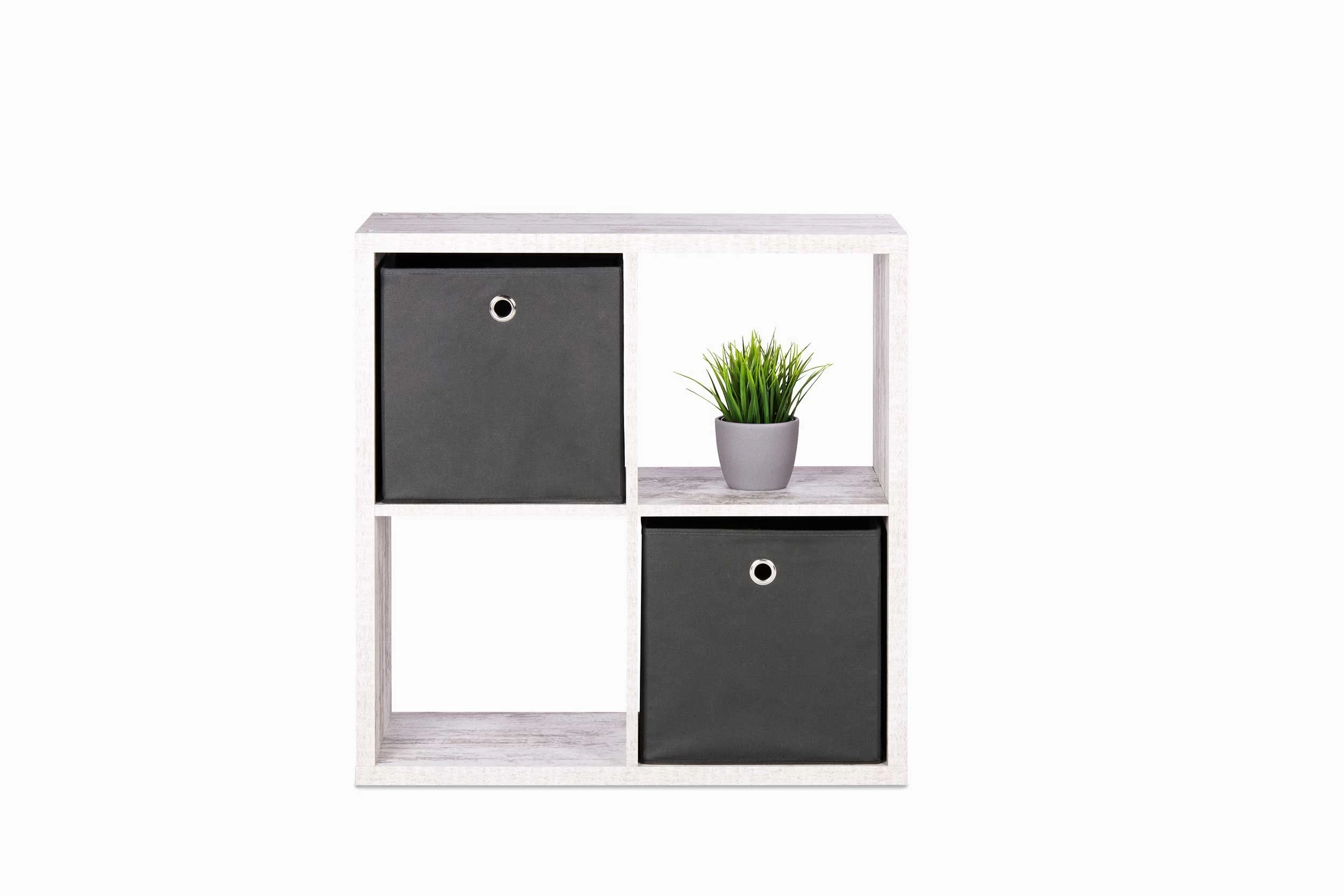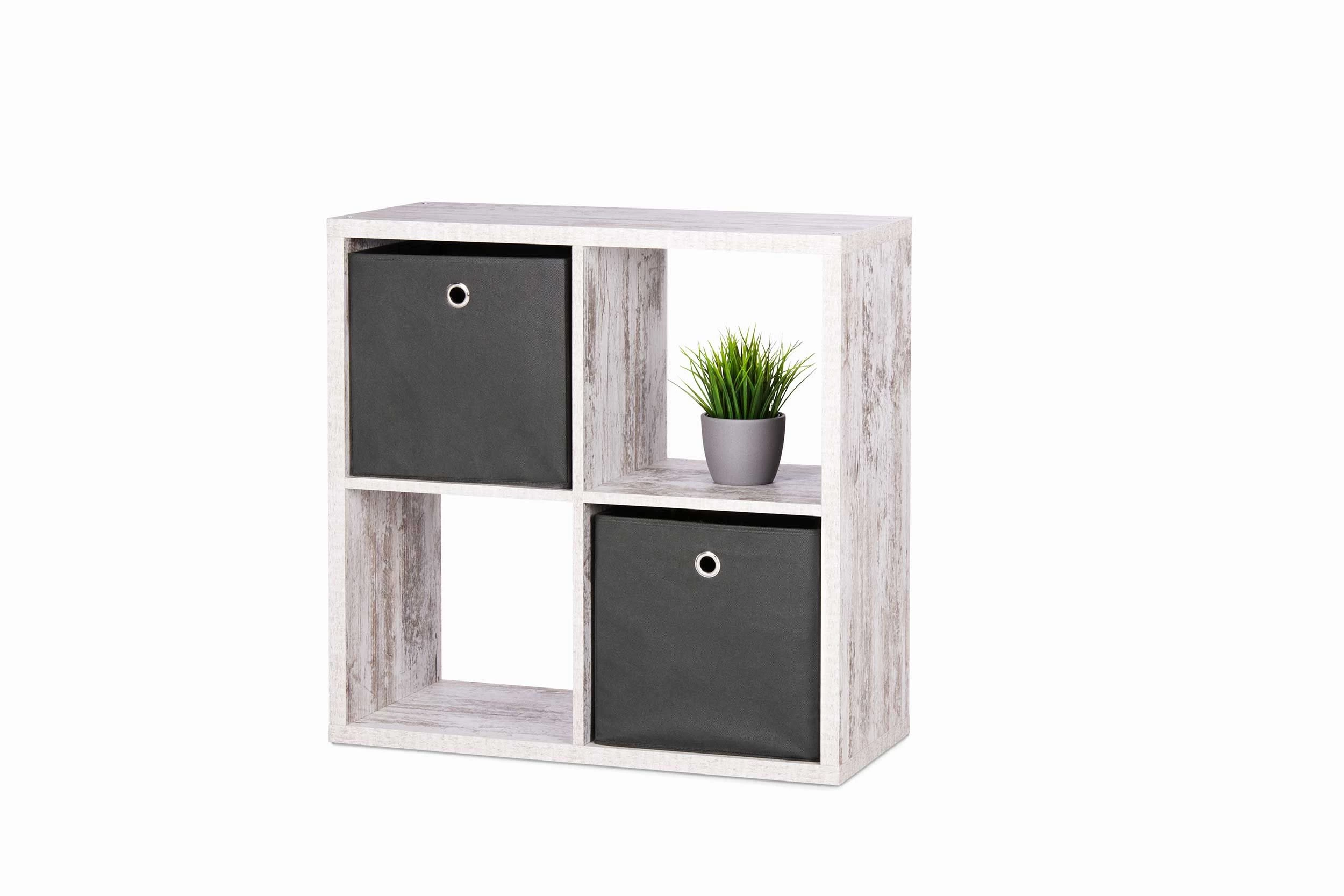 Opbergkast Max is gemaakt van spaanplaat van 25 mm dik en is afgewerkt in frescodecor. De kast telt 4 vakken. Ook leuk met enkele (kleurrijke) mandjes om ook kleinere spullen op te bergen.