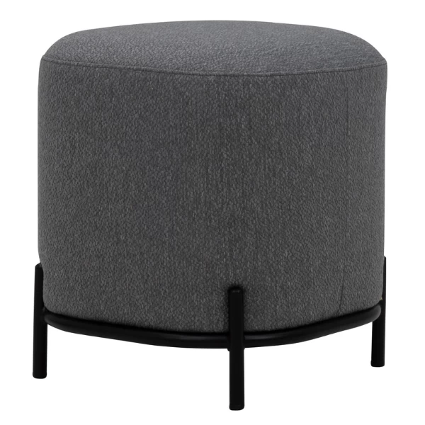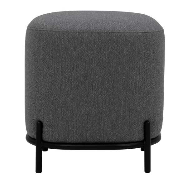 Poef Larry, 42×42 cm. Met een metalen onderstel en een donkergrijze stofbekleding.